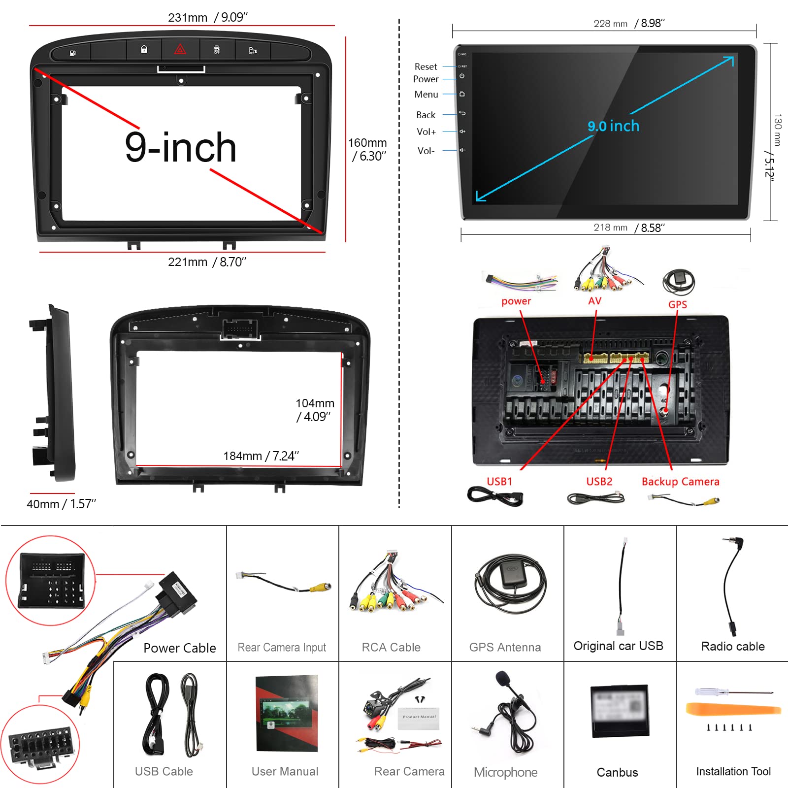 ["Car stereo with large screen, specially designed for Peugeot 308 408 2007-2015. ⚠NOTE: Only fits the same center console shape as shown in the picture. Dimensions: 231 (width top) x 221 (width bottom) x 160 (height) mm. 9-inch touchscreen with touch buttons. Full HD display, support for split-screen function. Comes with dedicated adapter cable and Canbus, no need to buy extra.","Android system, WiFi, GPS. Once connected to WiFi, you can download a free map of any country you need in the Here WeGo app (via the menu - Download map) for offline navigation. You can also enjoy online navigation and add other map apps. More Android apps are available for download.","Bluetooth, FM RDS radio, dual USB, Mirror Link. Built-in microphone, supports hands-free calls and Bluetooth music playback. Supports FM RDS radio, 4-32GB USB drive. Mirror Link (connected via USB cable) for IOS 17 and below, Android 9.0-14.0, giving you more options for media playback in the car.","Reverse camera. Includes a waterproof mini reverse camera with 12 lights for night vision and 6m AV cable. After proper wiring, the car player automatically switches to park mode when the reverse gear is engaged, displaying a clear and large rear view image, providing parking assistance.","Other functions. Multi-EQ setting. Supports video/audio input/output, subwoofer output. Supports external USB dongle (not included): DAB+, DVR, OBDII, Carplay, etc."]