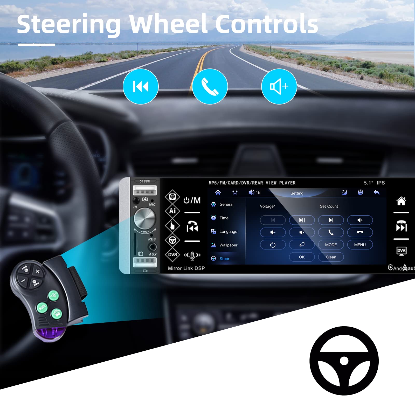 ["1. Car stereo 1Din & 5.1'' IPS screen: 1Din car stereo with installation size 178 (length) * 180 (width) * 50 (height) mm, easy to install. IPS touchscreen has the advantage of a large viewing angle, the resolution of 1024*600 could provide clear colored visual display, easy to use and easy to slide.","2. Carplay & Android Auto: This 1Din car stereo supports Carplay and Android Auto, you can use the functions on your phone in this radio by connecting via USB cable, to make calls, listen to music, email, notifications. Mirror Link is also available.","3. Rearview camera & Physical button: Equipped with rearview camera: automatically switches to the rearview display after proper connection; volume buttons next to the screen for easier and faster operation.","4. Bluetooth/FM Radio: Bluetooth 4.2 technology, no delay and high fidelity playback; online music, you can transmit music to the car stereo through FM, enjoy the original car radio sound, and with 18 preset radio stations.","5. Remote control: Support remote control, which can control the car stereo freely from the seat, please note that there is no battery on it."]