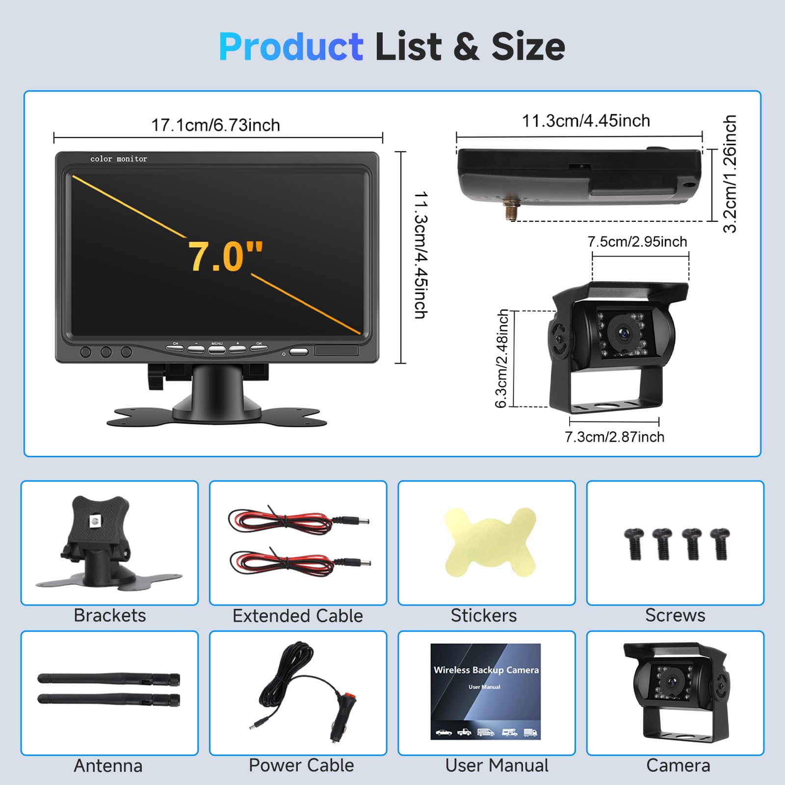 ["Improved wireless backup camera kit: Great for trailers, RVs, trucks, cars, and buses. With 7-inch LCD monitor for clear camera images. Easy to install, monitor and camera just need separate power supply.","1080P HD backup camera: With the 1080P HD backup camera, you can display a clear image on the monitor. Image mirroring and flip display are supported through monitor settings, with adjustable brightness, contrast, and color.","Supports up to 4 cameras and split screen: The 7-inch monitor supports up to 4 camera inputs (only 1 camera included) and supports simultaneous split screen display of 4 images, providing you with 360-degree protection while driving.","IP68 waterproof and night vision: Backup cameras are IP68 waterproof and feature excellent night vision design, fearless in rainy weather or dimly lit environments, always delivering clear camera images.","Blind spot detection: With blind spot detection (BSD), you will be immediately warned if a vehicle is detected in the blind spot. This helps avoid accidental and unnecessary traffic collisions."]