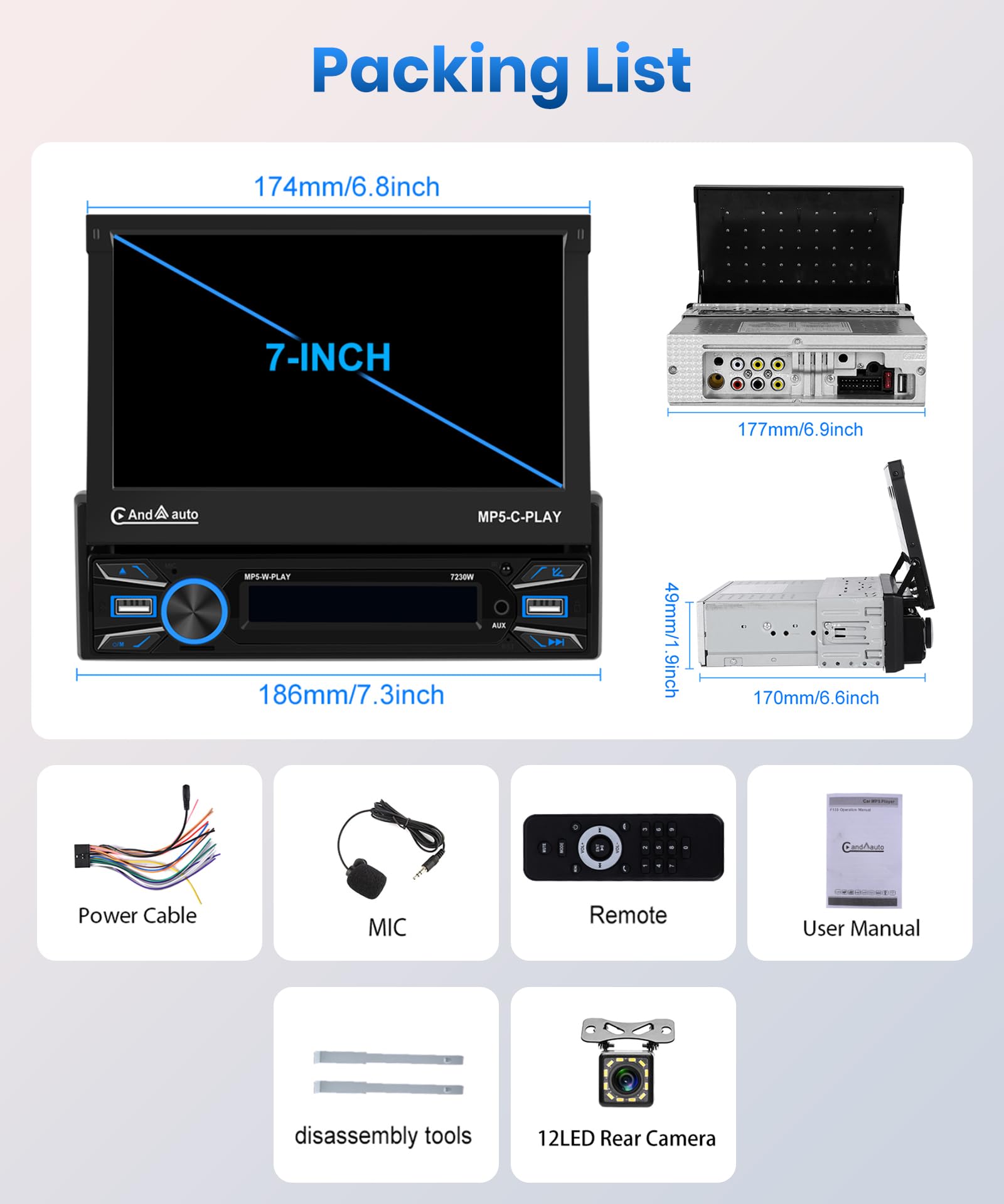 ["Wireless Carplay car radio with retractable screen: Support wireless Carplay and wireless Android Auto by connecting Bluetooth. The installation size of this 1-Din car radio is 178*141*50. The buttons below can adjust the angle of the screen, which stands out. The small screen can display FM, please make sure to connect the ILL small light cable.","Mirror Link for IOS/android: Support Mirror Link for ios and Android Auto, no need to download App, ios: One-Way, it means you can only operate your phone. Android phones: Two-way control. There are two USB slots in front of the radio and a Type C port that can meet the needs of your different connections.","Bluetooth 5.1/FM Radio: Bluetooth 5.1 enables faster data transfer. Also supports multiple audio streams, allowing for seamless switching between different audio sources. More reliable wireless connection for hands-free calling. Online music can be transmitted from this car radio via FM to enjoy your original car radio, 18 preset radio stations.","Reverse camera/Steering wheel control: Equipped with 12LED night vision waterproof reverse camera. After wiring, when the reverse gear is engaged, it automatically switches to the reverse camera, and the reverse assist cable makes reverse driving safer and more convenient. After connecting the control line in the power cable, you can use steering wheel control, you can conveniently change songs and make/receive calls.","7 Colors Button/AUX-IN: The button illumination has 7 colors to choose from, so the color in your car is no longer monotonous. Supports USB/SD/AUX/MIC input, compatible audio formats include MP3/WMA/AAC/APE/OGG/M4A/RA/WAV Video format: H264 DIVX HD 720P/1080I 1080P/AVI/FLV/MKV/RMVB/MPEG/ASF/TS/H264/QT"]