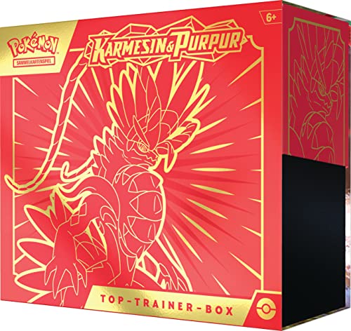 ["Embark on a new adventure with Pokémon-ex and travel through the Paldea region", "Meet the first partner Pokémon Felori, Krokel, and Kwaks and explore the power of Legendary Pokémon Koraidon and Miraidon as Pokémon-ex", "The Pokémon Trading Card Game expansion Crimson & Purple includes new Pokémon from the Paldea region and introduces Teracrytal Pokémon-ex", "Includes 1 holographic full-art promo card with Koraidon, 65 card sleeves featuring Koraidon, 45 Pokémon Trading Card Game energy cards, 1 game guide for the Crimson & Purple expansion, and 9 booster packs of the Crimson & Purple Pokémon Trading Card Game expansion (Each booster pack of the Crimson & Purple Pokémon Trading Card Game expansion contains 10 cards and 1 basic energy, with 3 guaranteed holographic cards per booster pack)", "You also receive 6 damage counter dice, 1 coin flip die allowed in competitions, 2 plastic markers for Special Conditions, 1 storage box for holding all items with 4 divider tabs for organizing, and 1 code card for Pokémon Trading Card Game Live", "The Elite Trainer Box includes everything you need to take your Pokémon Trading Card Game strategy to new heights"]