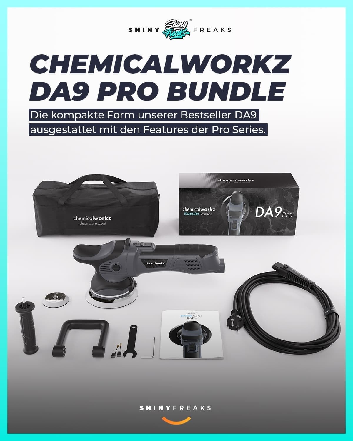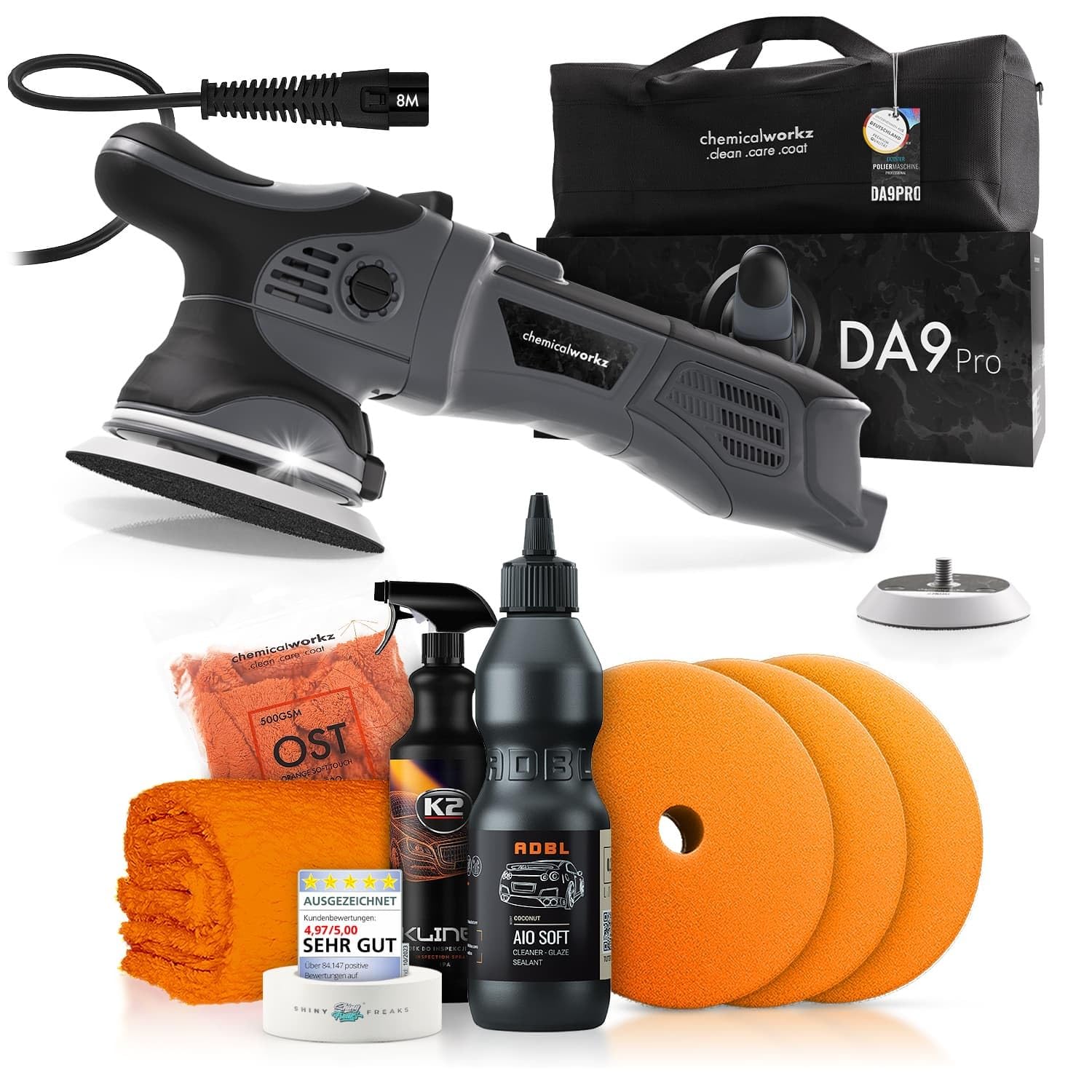 Polishing machine set: chemicalworkz DA9 Pro dual action polisher + ADBL One-Step polish + Royal Pads polishing pads + accessories - car paint polish, scratch removal, restoration | 8 pieces