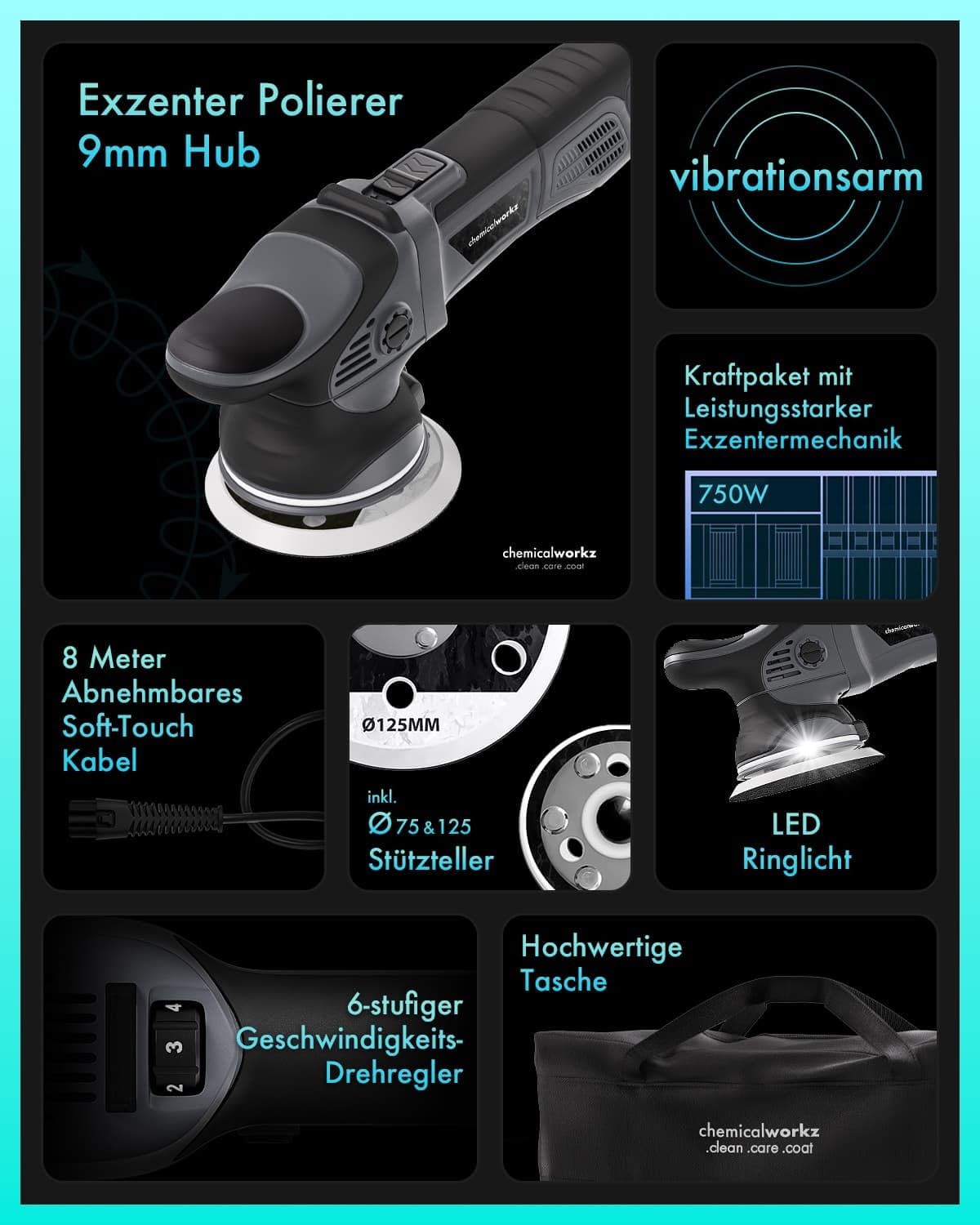 ["π₯ ππππ πππππͺπ’π₯ππ πππ΅ π£π₯π’: Compact eccentric polishing machine with 750 watts, 9mm stroke, and pro features. Includes 75mm & 125mm backing plates, removable 26ft cord, and LED ring light. Offers quiet, vibration-free performance and precise speed control. Ideal for versatile vehicle care.", "β