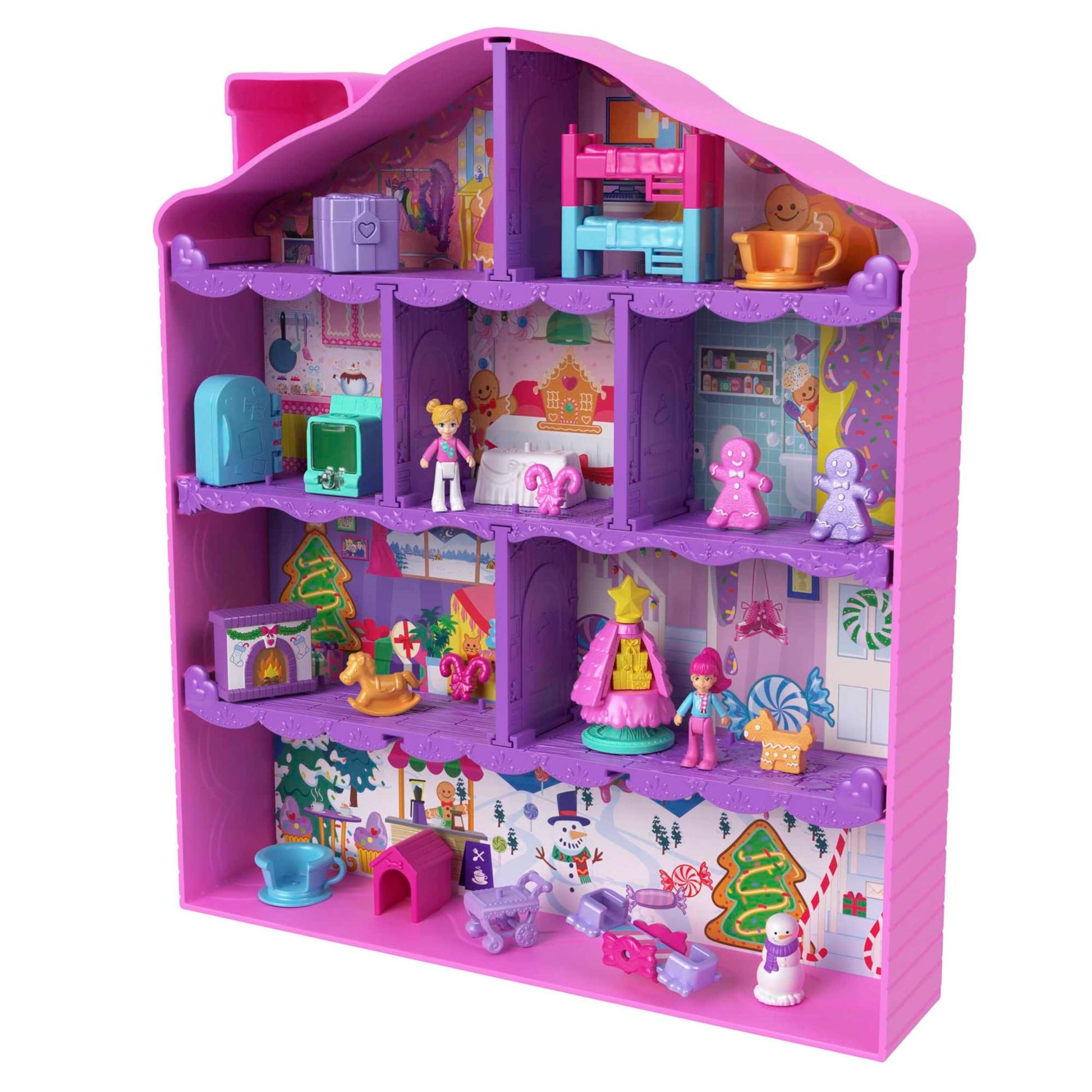 POLLY POCKET Advent Calendar House - 25 surprises, 2 dolls, 27 accessories, gingerbread house design, Christmas tree, skis, for kids ages 4 and up, HKW16