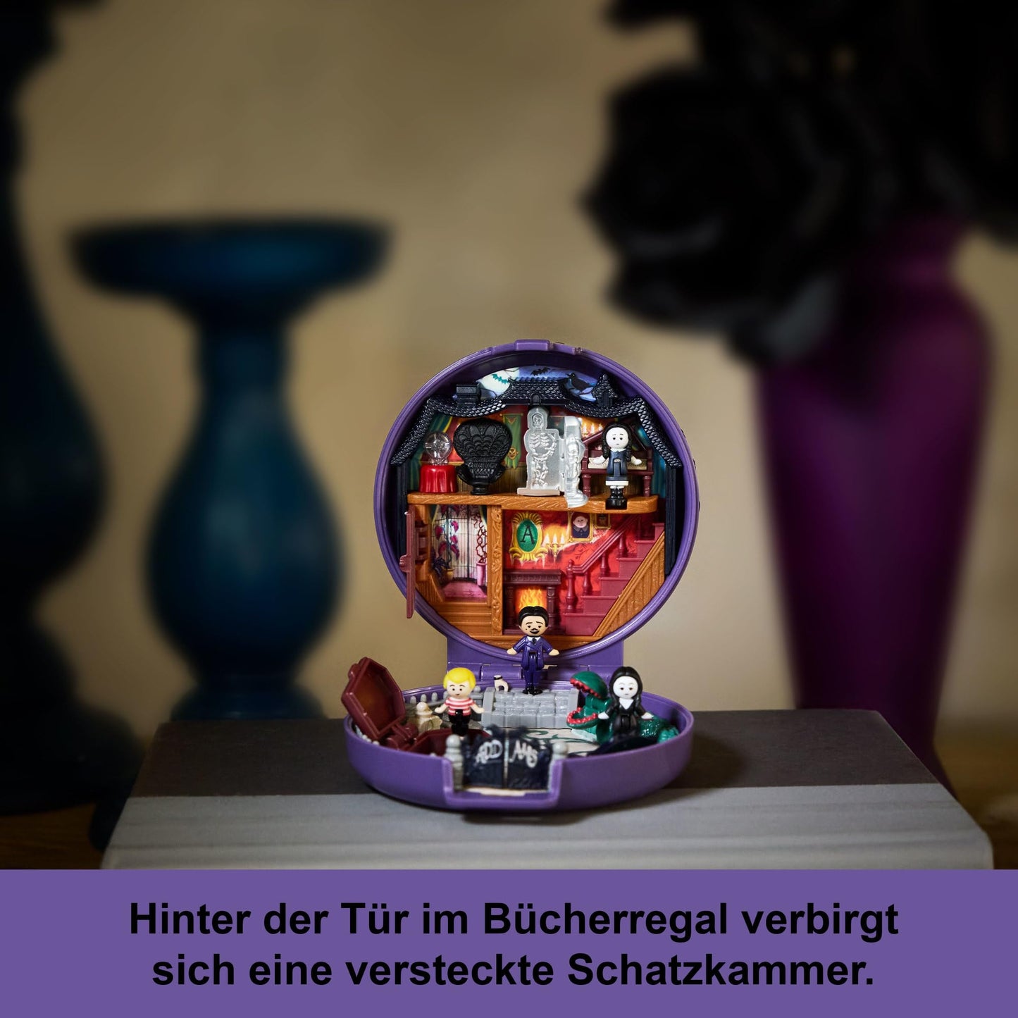 "Buh! Every night is Halloween in this The Addams Family x Polly Pocket collector's treasure chest."