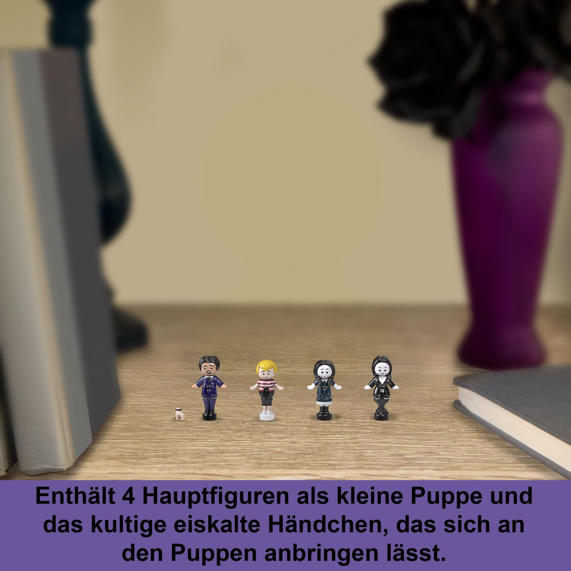"The Addams Family has shrunk! Fans can play with the 4 main characters, 1 icy hand, and several legendary locations from the animated series."