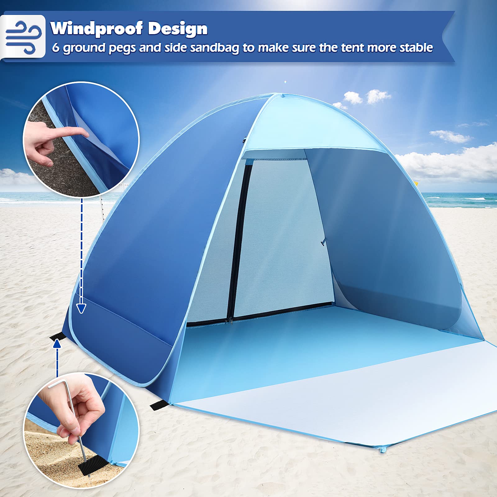 ["【Anti UV 50+】 The pop up beach tent is made of 190T waterproof, silver-coated polyester fabric that protects against UV UPF 50+. All materials are non-toxic, tasteless, comply with international standards, and are suitable for adults and children. The beach tent also has the properties of heat insulation and breathability, allowing the beach tent to stay cooler and more comfortable.","【Privacy & Ventilation】 The front door of the beach tent is equipped with 4 buckles. The back door of the beach tent has a zipper. You can close both doors completely to protect your privacy. Or you can open both doors to maintain ventilation. The entrance door is extended to 220 x 80 cm, providing space for more people to play.","【Easy Installation & Small Package】 Installing the pop-up beach tent is very easy and the entire construction process takes only 1 minute. The pop-up beach tent is packed in a 46 × 46 × 3 cm storage bag. The weight is only 1 kg. So the pop-up beach tent is very light and portable. You can take it with you or put it in the trunk of a car.","【Good Stability】 The pop-up beach tent is equipped with 6 pegs to keep our pop-up tent in place in the wind. The two side sand pockets increase the weight of the beach tent to keep it stable. Don't worry about windy days.","【Widely Used】 The pop-up beach tent provides a shaded area from the sun. You can use it at the beach, in the garden, or in the park. Or use it as a retreat for the kids. We offer a 1-year free replacement warranty. If you are not satisfied with the pop-up beach tent, please contact us first."]