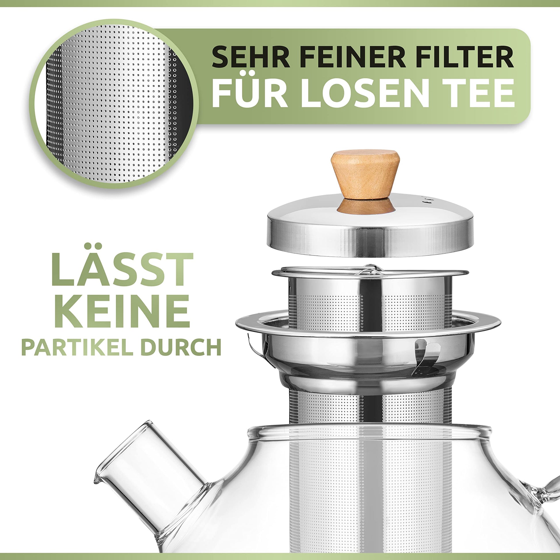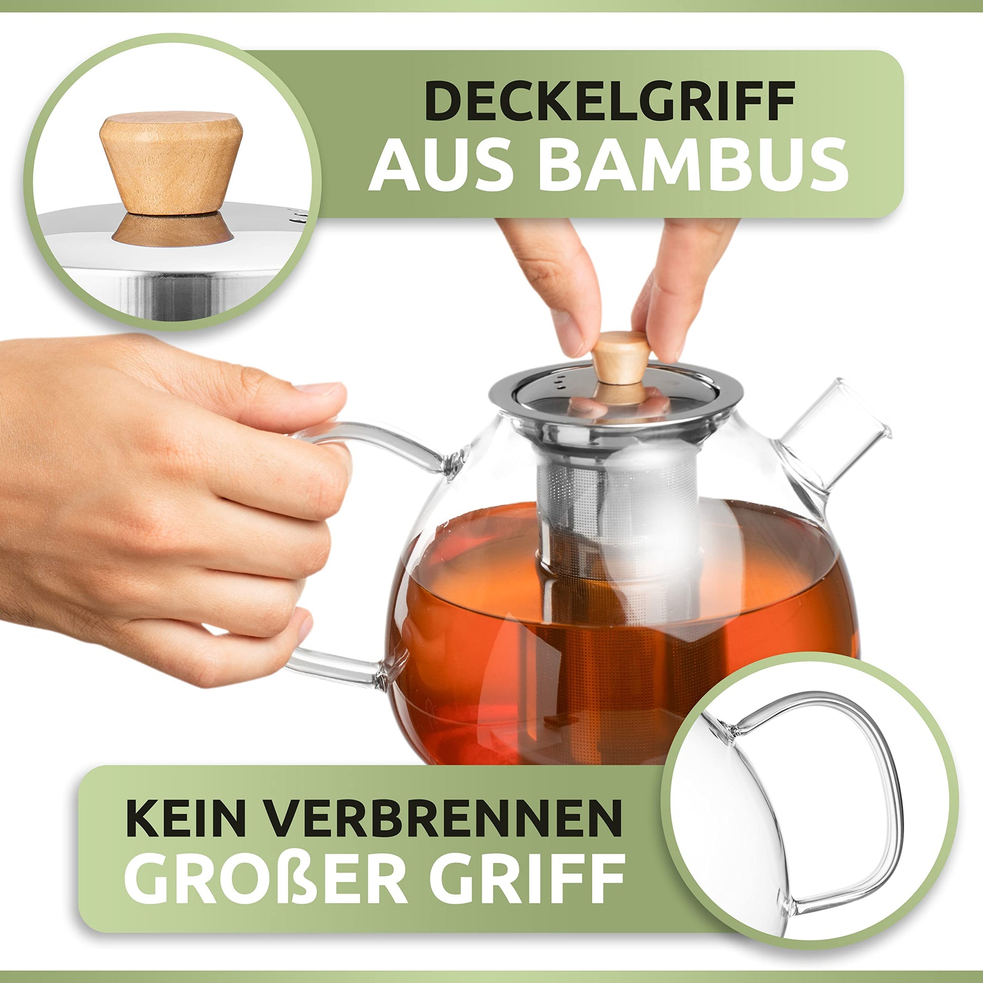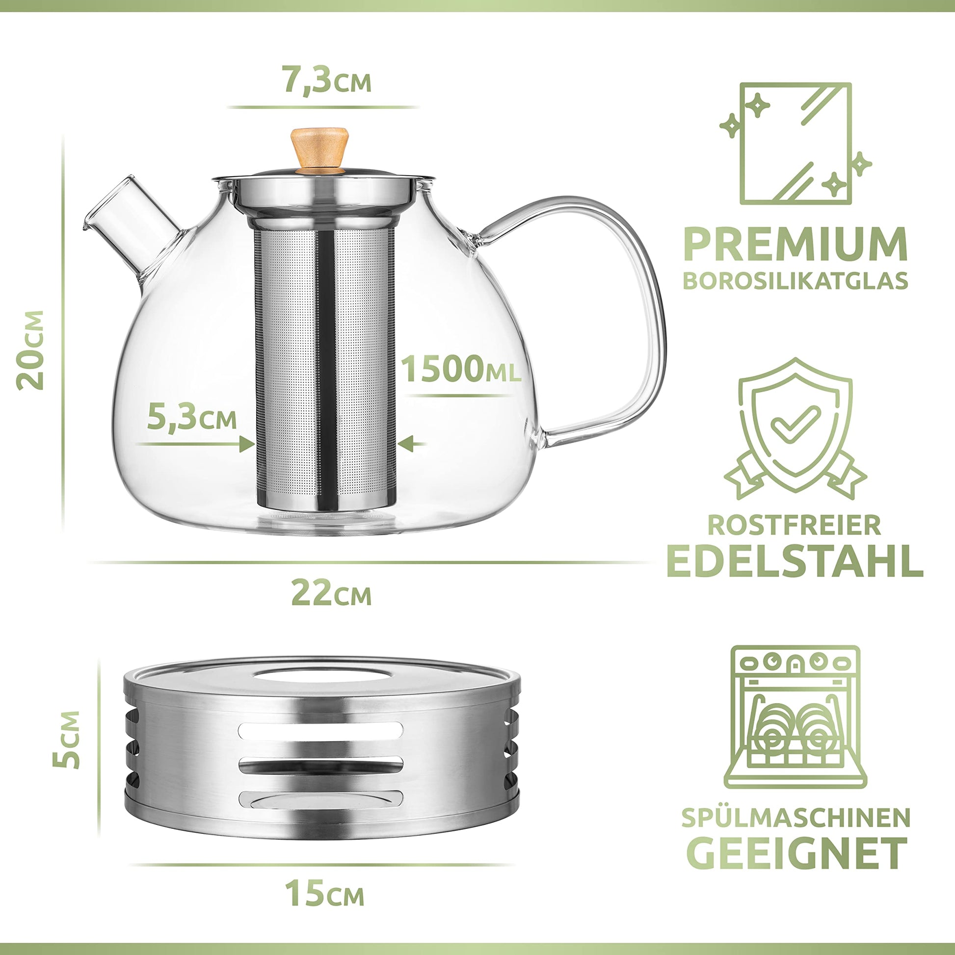 ["✔️ HIGH QUALITY TEAPOT: The bamboo handle on the lid prevents burns when removing the lid. The lid and strainer are made of stainless steel, ensuring no rust. Made of heat-resistant borosilicate glass, our teapot can withstand temperature fluctuations from -30°C to +150°C.","✔️ PREMIUM STAINLESS STEEL HEATER: Whether it's tea, coffee, or other drinks, the stainless steel heater will keep the drinks pleasantly warm without needing to reheat them.","✔️ EASY TO CLEAN: All parts of the teapot, including the stainless steel strainer, are removable for easy hand cleaning. They can also be placed in the dishwasher.","✔️ ECO-FRIENDLY: The teapot is made of 100% safe materials and is always tested to our high quality standards. It does not contain any environmentally harmful BPA.","✔️ A REAL EYE-CATCHER: In the cozy evening twilight, a fantastic light show illuminates the warmer with the teapot, spreading a great visual appeal over the entire table. An ideal gift for all tea lovers."]