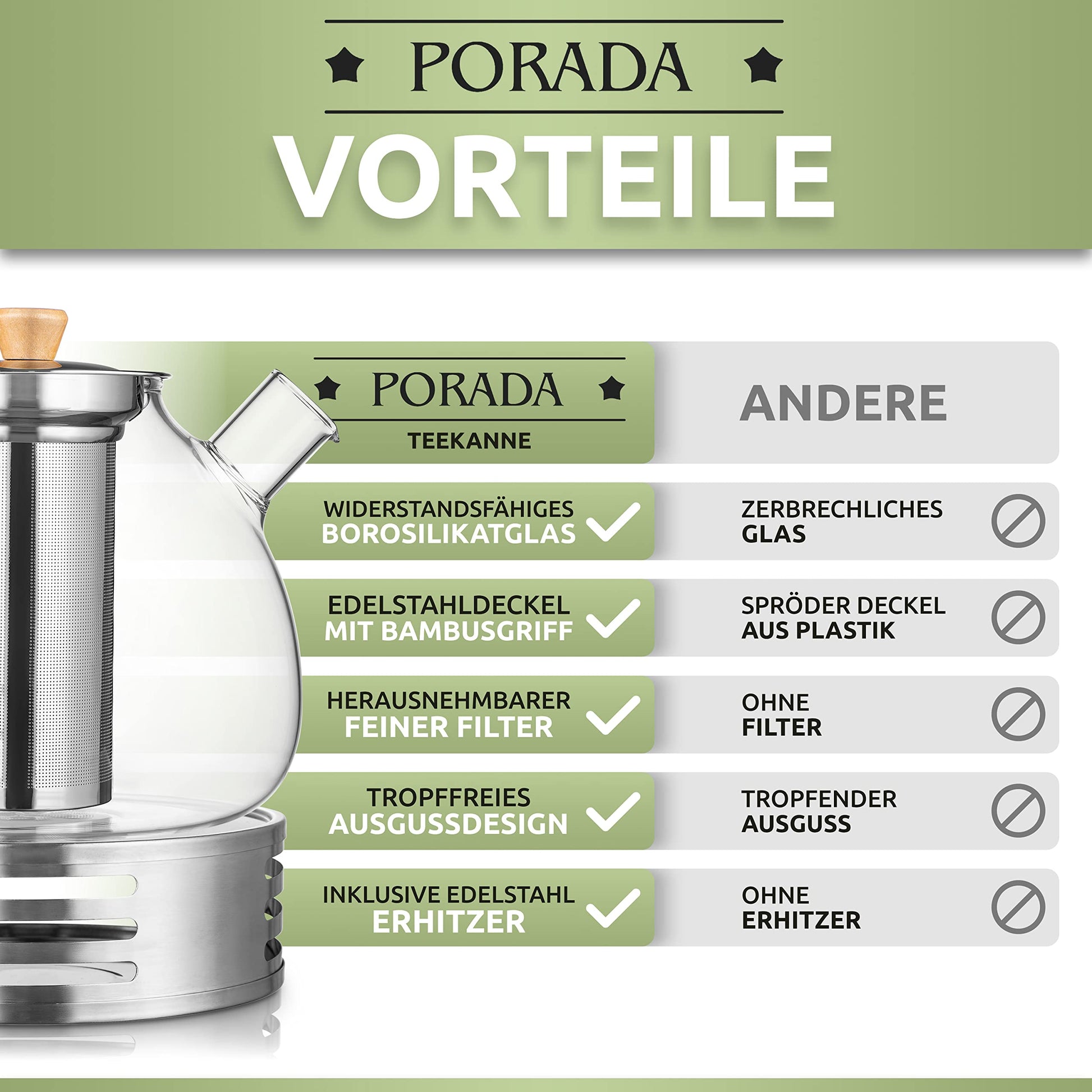PORADA Glass Tea Kettle with Stainless Steel Heater Infuser Teapot Tea Pot Teapot with Filter Turkish Tea Pot Warmer (1500ml)