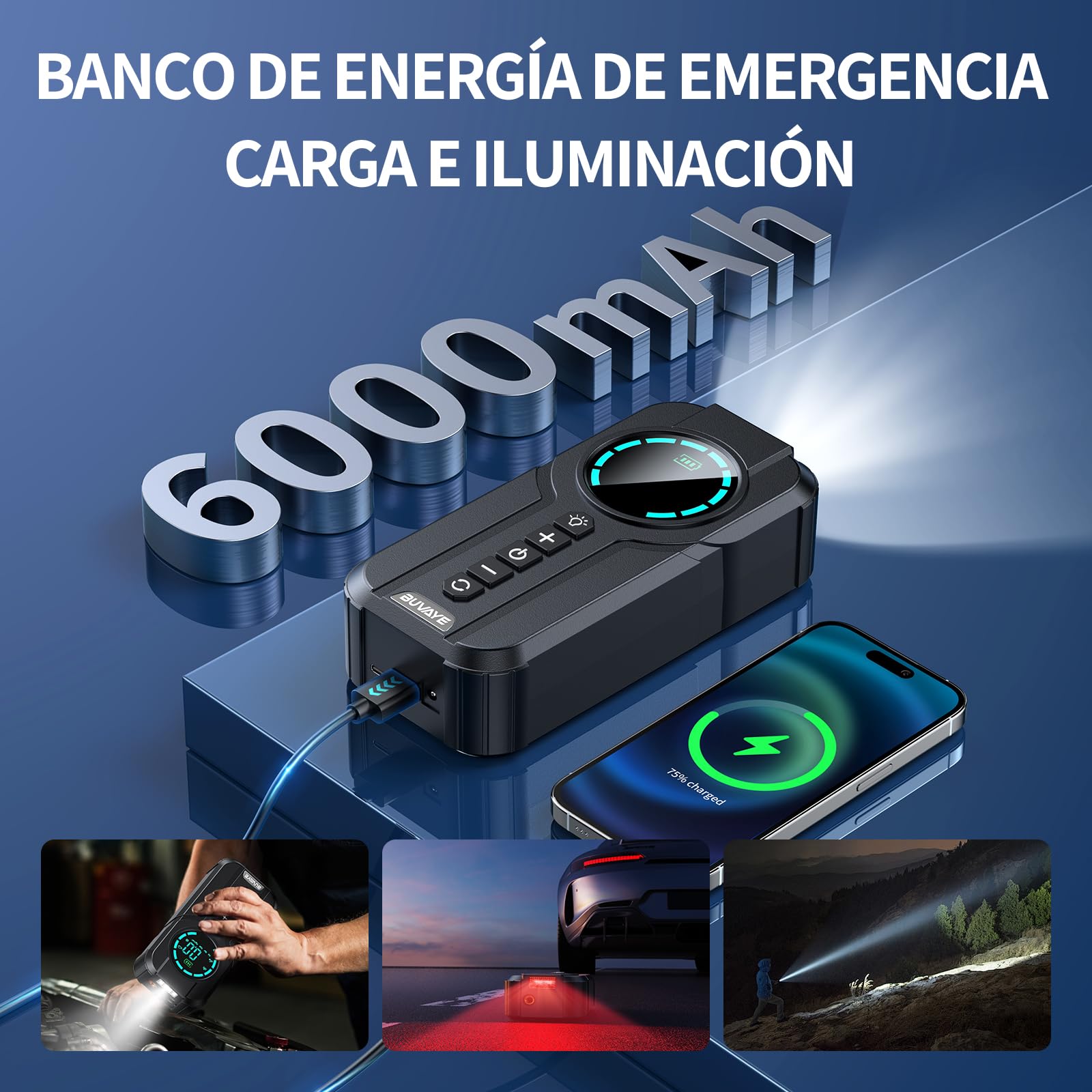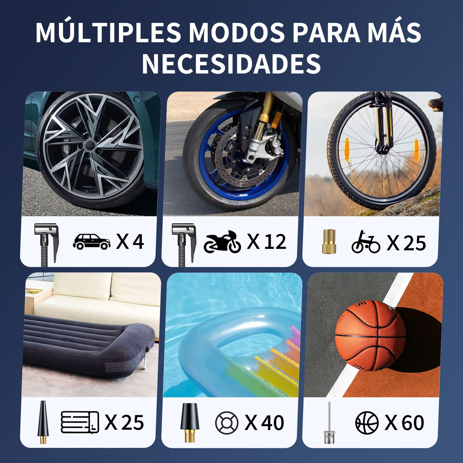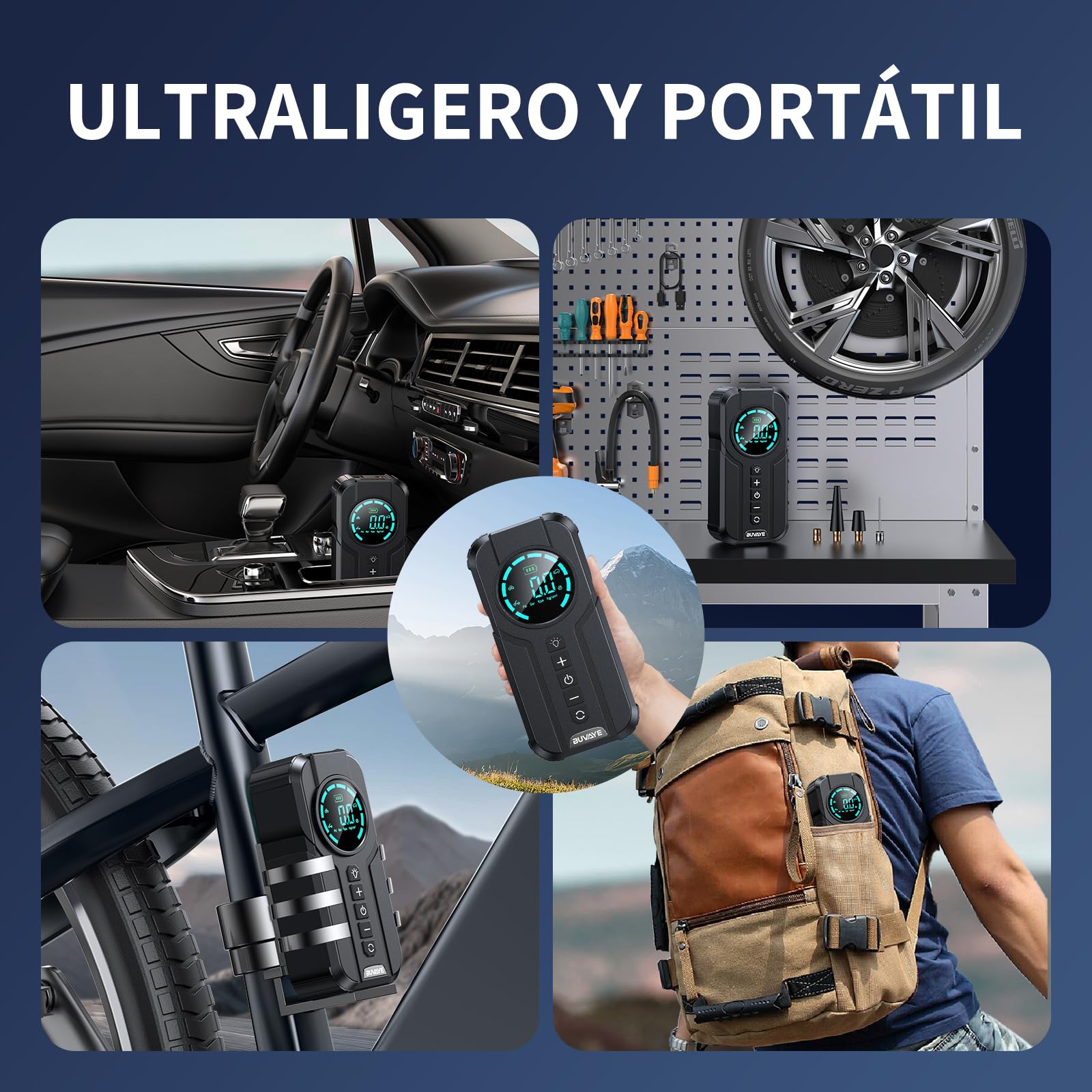 ["👍【Fast Inflation】The portable air compressor provides a maximum pressure of 150 PSI and an air flow of 38 l/min! It only takes 4 minutes to fully inflate a car tire (0-36 PSI), or 30 seconds to top off a car tire in everyday life (28-35 PSI). This electric air pump for cars is definitely a good helper for solving emergencies on the road.","👍【6000 mAh Long Battery Life】The electric air pump of the tire inflator has a built-in large 6000 mAh battery. This allows you to pump up any device without external power supply and get rid of annoying power cords. With a single charge, you can inflate 4 car tires from 0-36 PSI or 12 car tires from 28-36 PSI.","👍【4+N Smart Modes】The battery-powered air pump has 4 types of preset filling modes (cars, bicycles, motorcycles, and balls) for beginners to conveniently choose from. In manual mode, you can adjust pressure values (5-150 psi) according to the inflation object. The operation is simple, user-friendly, and meets your various inflation requirements. In addition, thanks to its compact size, it easily fits into your car, bike carrier, or backpack.","👍【Digital Display】The large LED display shows both the real-time pressure value and the preset value, making it easy to read and monitor the tire pressure status. With a maximum pressure of 150 PSI and automatic shut-off, you get intelligent inflation. You don't have to worry about overinflating your tires. Furthermore, the 5V/2A Type-C input and 5V/2A USB output port make it an emergency power supply for your phone.","👍【3 Modes LED Light】You no longer have to worry about inflating in the dark! The battery-operated compressor has three LED light modes: flashlights, warning lights, and SOS lights. This makes it helpful for roadside emergencies and nighttime use. Additionally, the 10.5-foot cable is long enough to connect to a cigarette lighter socket and can be routed around each of the four sides to reach the tires."]