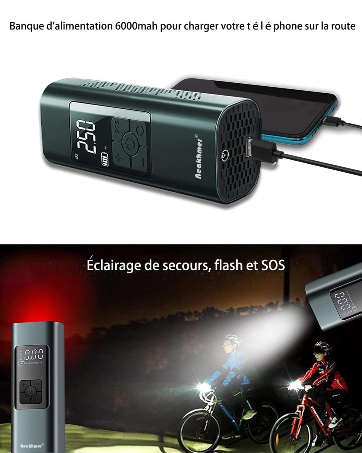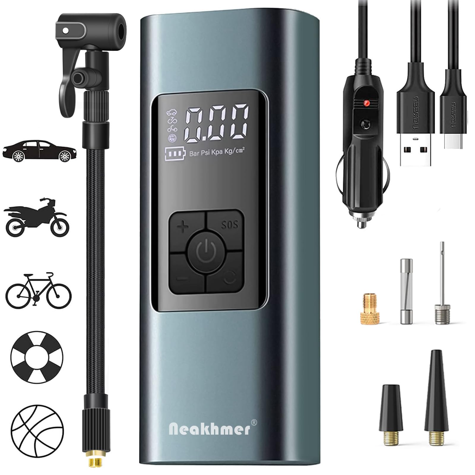 ["Powerful, Mini Tire Inflator, max150 PSI (10.3 bar): Size of portable air compressor (17 x 6.9 x 5 cm), only 548 g. Rechargeable built-in battery: 3x2000mAh. Equipped with Type-C plug and car charger for convenient and quick charging. so that you can easily inflate all SMALL cars (only for small cars), bicycles, motorcycle tires, swim rings, inflatable toys, and other inflatable products within minutes without any problems.", "DC 12Volt or battery-powered air compressor: Compared to other portable air pumps that only support battery power, this means that you can only use that tire pump when it is full of power. But we have solved this design flaw, when the cordless air pump is turned off, you can connect it to the car's cigarette lighter for power and inflate your car tires directly (Please make sure your car engine is on), it's a truly emergency tire pump.", "This portable air compressor can be used as a power bank: It has a USB port that provides you with a power bank function to charge your smartphone in case of emergency. It also comes with a durable nylon bag for convenient storage and transport of the inflator. A great gift choice for your friends and family. A best friend on trips.", "Auto-stop and built-in memory function: 4 optional units of PSI, BAR, KPA, Kg/cm2. When the inflation volume reaches the preset value, the pump automatically shuts off to avoid over-inflation. (Please set the pressure value first. NOTE: CLICK on the “Loop Button” to select the desired mode. HOLD the “Loop Button” to select the desired unit.)", "Tire inflator with digital pressure gauge and light: This tire inflator with digital air compressor has a bright LCD screen. You can easily use the tire pump in the dark. This cordless tire inflator also features an SOS and lighting function to assist you in emergency situations. We provide 24-hour customer service. If you find anything wrong, you can contact us anytime on your order detail page \"Contact Seller\".", "Auto & Motorcycle Tools Tools for Tires & Wheels AIR PUMP Automotive Automotive Accessories Air Pumps"]