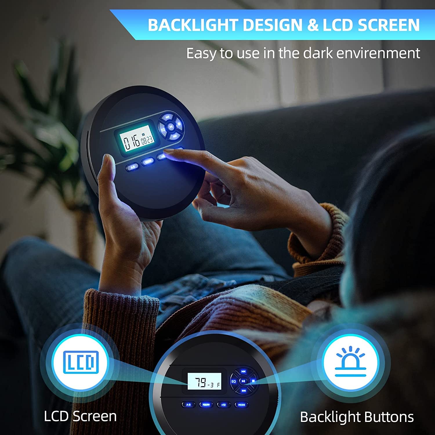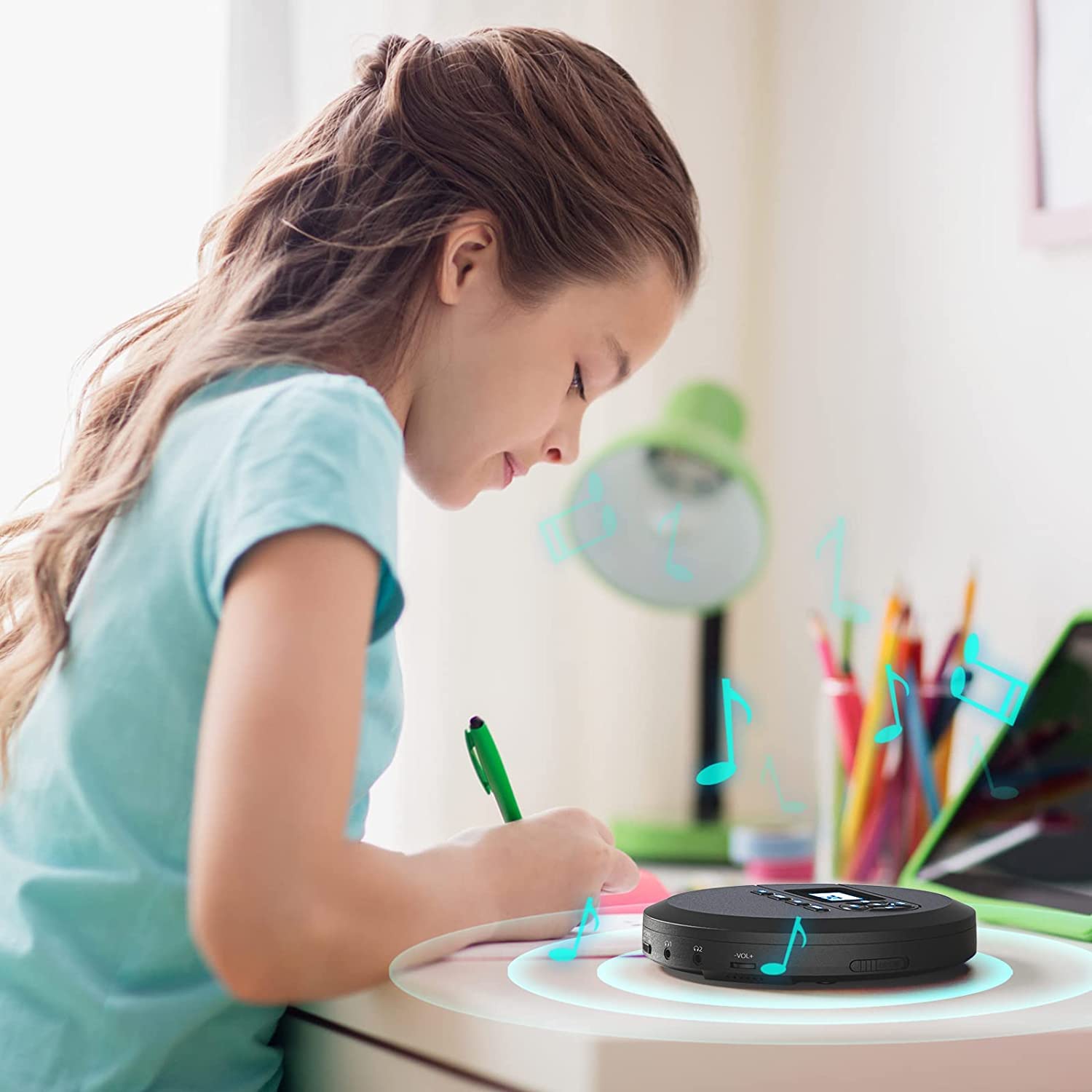 ["【Car CD Player】New model portable CD player with built-in FM transmitter. It can be paired with the car through FM frequency, wirelessly and conveniently. 5 different FM frequencies can be used. You can also connect the player to the car via the AUX cable.","【CD Player with Two Speakers】This small CD player comes with two speakers. When listening to music or audiobooks at home, you don't need to use headphones. It also has two headphone jacks and they can be used together. When you are outdoors, you can easily share the music with others.","【Rechargeable CD Player】An upgrade of the 2000mAh battery brings you a better user experience. It can support longer playback time, and you don't need to change the battery or always connect the charging cable to the CD player when playing music.","【A-B Repeat and PROG】A-B repeat and PROG functions are useful for children and learners. A-B repeat can replay a content you need. The PROG function can help you select the desired music and play them in order. Both can help you quickly play the desired content.","【Anti-Skip and Backlight Display】With the Kpop CD player featuring anti-skip function, you can smoothly listen to music. The LCD screen and buttons have a backlight design, allowing you to use it easily in dark environments."]