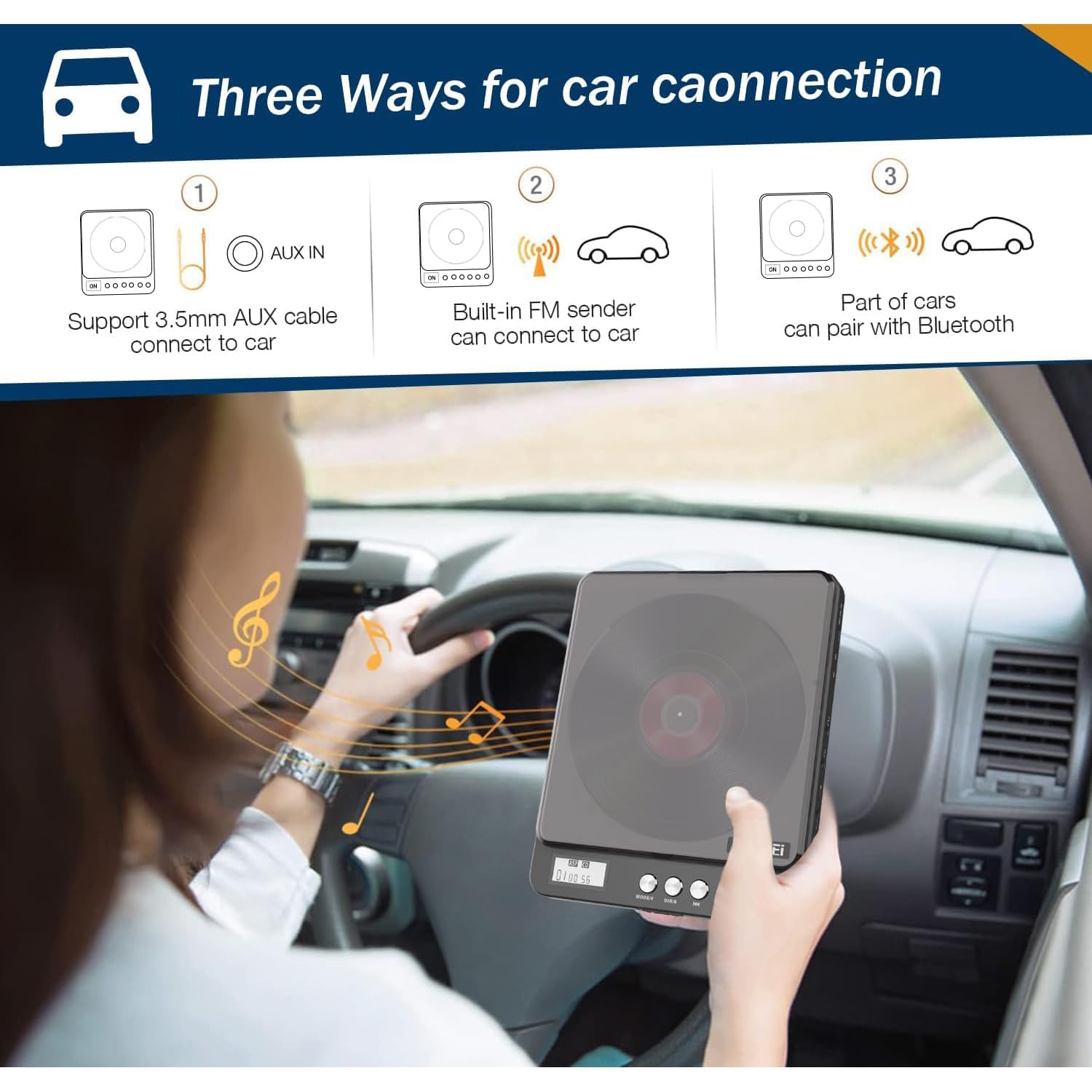["【BLUETOOTH CD PLAYER SMART CONNECTION】The Portable CD Player supports Bluetooth 5.0, providing a larger wireless range and faster Bluetooth connection. It can easily be paired with Bluetooth headphones or speakers. Our personal CD Player is also compatible with other audio devices via a 3.5mm audio jack.","【CD PLAYER FM TRANSMITTER FOR CAR】Long press the FM Transmitter button to turn on, connect to the car radio on the same frequency, and then connect your CD player. Play music or audiobooks from CD players through the car stereo system. Preserves high-fidelity sound through the FM radio signal (Note: This CD player does not support FM radio). You can listen and learn, portable CD players can be anytime, anywhere due to its small size.","【2000MAH BATTERY, LONG PLAYTIME】The portable CD player with built-in 2000 mAh rechargeable lithium battery can play continuously for over 10 hours. Convenient charging with the included USB charging cable. No need to use AA batteries or keep the charger plugged into the CD player all the time. CD player with dual headphone jacks allows you and your family members to enjoy your favorite music or listen to soothing music.","【PORTABLE CD PLAYER STRONG COMPATIBILITY】Supports CD, MP3 CD, CD-R and CD-RW. Portable CD player with built-in dual stereo speakers. You can play music through the speakers so you don't have to wear headphones all the time. You can use this CD player in 4 ways: Bluetooth, speaker, headphones, Aux connection for external speakers/cars. Built-in 3.5mm Aux input/output and a headphone jack.","【ANTI-SHOCK】Using advanced shock protection technology, stereo with CD player supports CD with 160 seconds anti-skip protection, MP3 CD with 300 seconds anti-skip protection. You can use it in all kinds of situations, such as in a bumpy car, the portable CD player still plays smoothly. It is an ideal gift for music lovers, language learners, seniors, kids, friends, and mothers."]