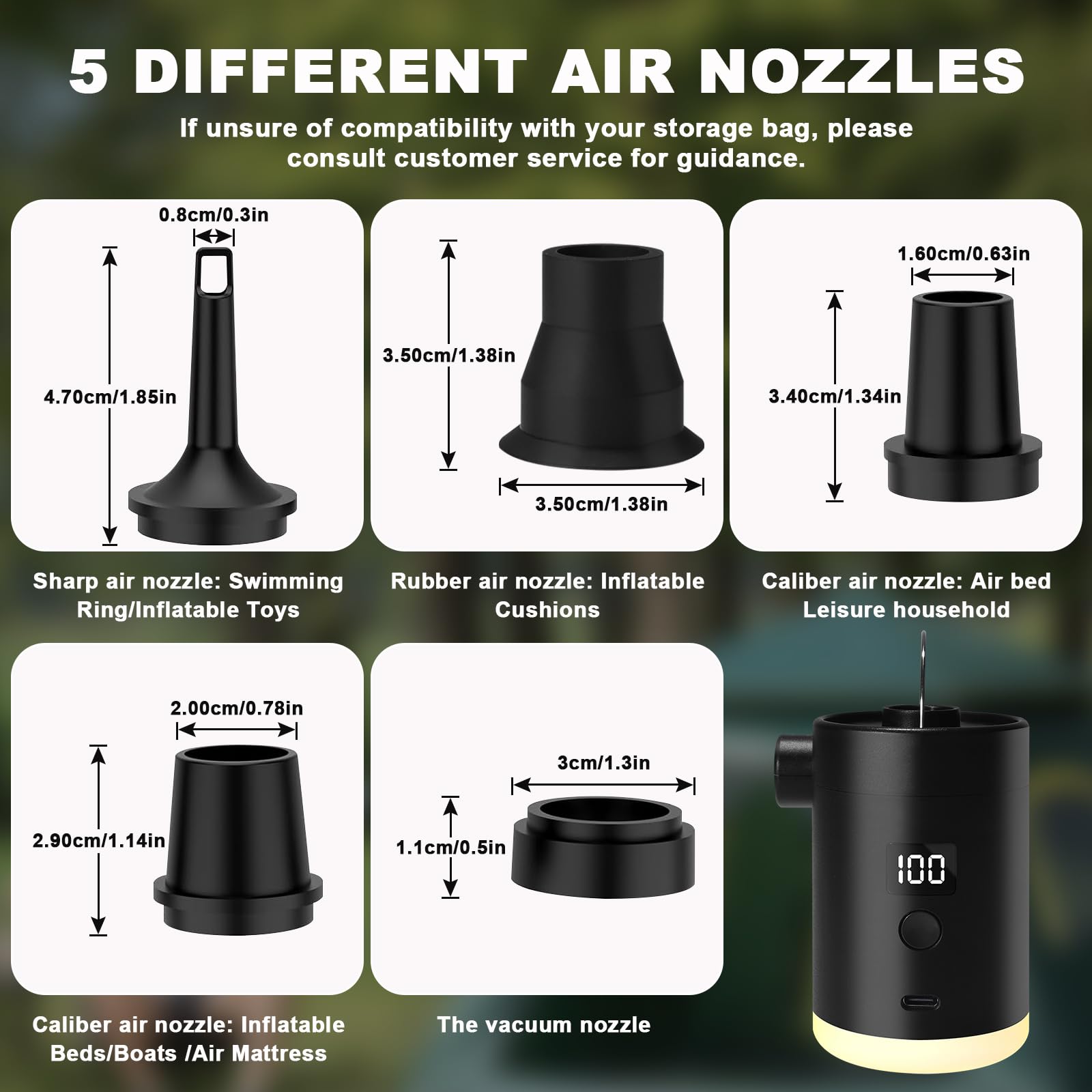 ["Perfect for on the go: Our travel air pump is incredibly compact, measuring just 2.17 x 2.17 x 3.54 inches and weighing only 6.35 ounces. It easily fits into your backpack or even your pocket. The pump also features a 2-level brighter camping light, making it perfect for outdoor adventures and daily use. The integrated hook design allows you to conveniently hang the pump in your tent;","Easy to use: Equipped with a dual motor pump, this air pump makes inflating and deflating your inflatable products a breeze. It can quickly inflate small to large inflatable items such as air mattresses, pool floats, sleeping pads, and more. The powerful motor provides a maximum air pressure of 4.5 kPa and a maximum air flow rate of 450 L/min, ensuring fast and efficient operation;","High-capacity battery and LED display: The air pump features a built-in 4000 mAh lithium polymer battery that allows for up to 30 minutes of continuous use on a single charge. The large LED display shows the battery level, allowing you to easily monitor and manage it. Charging is quick and convenient via the Type-C port, with a full charge taking only 4 hours;","Versatile and diverse: This portable air pump comes with 5 different nozzles that are compatible with a variety of inflatable products, including air mattresses, pool floats, swim rings, and more. It is not only suitable for inflation, but also for deflation, making it an essential tool for both outdoor activities and home use. Note: It is not suitable for high-pressure products such as balloons, boats, tires;","Optimal performance: The air pump is equipped with a special pressure sensor that adjusts the motor speed to maintain optimal air pressure during inflation. This ensures that your inflatable products are fully inflated, providing the best possible performance and comfort;"]