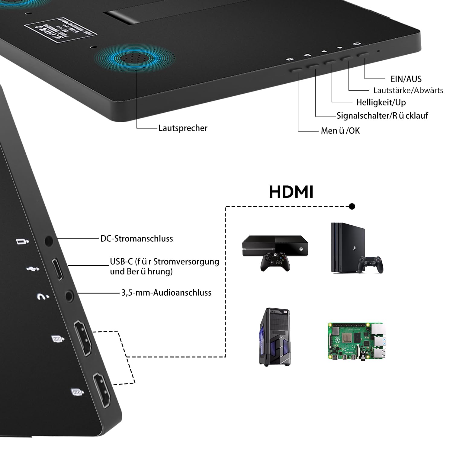 ["FHD 1200P Portable Monitor"]10.1 inch touchscreen portable monitor IPS screen, Full HD 1920 x 1200 high resolution, provides more precise color restoration of the touch monitor, exquisite image quality and richer colors. 178° viewing angle, 100% sRGB, 16.7 million colors, HDR support, 340 cd/m² brightness, and a contrast ratio of 1000:1 ensure clearer, smoother, and superior performance in gaming/multimedia.["Multipart Touchscreen Monitor"]portable monitor supports 10-point touch function, is quite responsive, precise, and fluid, allowing you to swipe, scroll, select, zoom in, zoom out, and move a cursor in about 3-5 ms. When you connect the USBC cable to your device, you can use the touch function to increase your work efficiency.["Plug & Play USBC Monitor"]portable monitor with two HDMI ports and a USB Type-C port (for touch and power supply only), compatible with various devices such as PC/laptop/computer/PS3/PS4/Xbox/Switches. No additional driver is required. Simply connect the screen to the device via the HDMI interface and power the USBC touch port to use the touch function.["Flexible Display Modes"]laptop monitor can be used as a secondary screen in three modes: duplicate mode, extension mode, and second screen mode. Whether you are using a phone or a laptop, the touchscreen monitor seamlessly integrates with various devices, allowing you to use it as an external display or mirror your screen for presentations and more.["Lightweight Portable Monitor"]With a weight of only 1.1 pounds and a thickness of 0.5 inches, this touchscreen monitor can easily fit into your briefcase or backpack and is the best choice for business trips, travel, or home entertainment. Built-in dual speakers deliver rich sound with crystal-clear audio quality when watching videos and playing games.