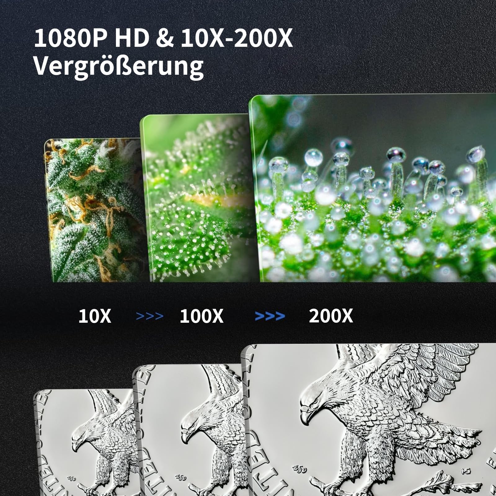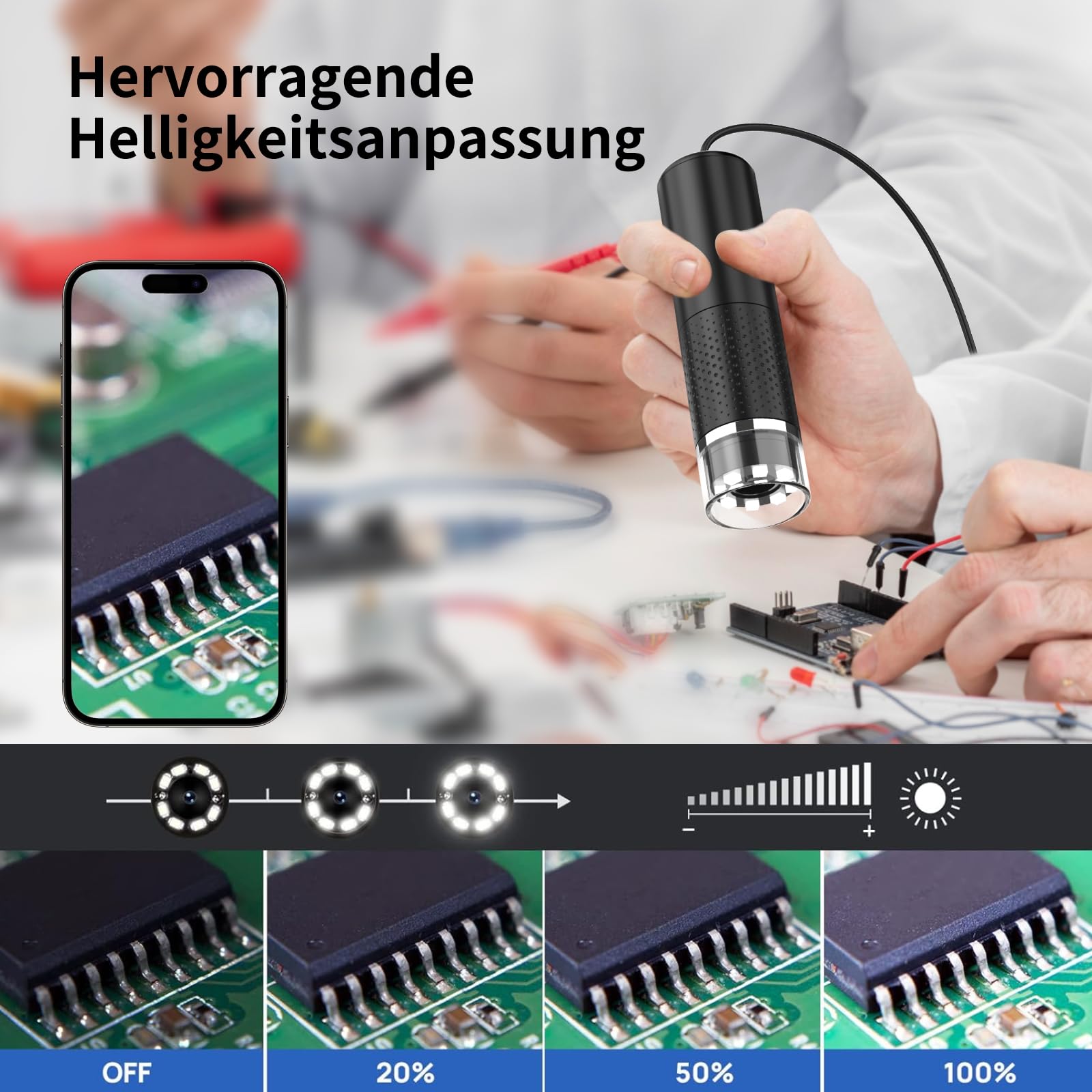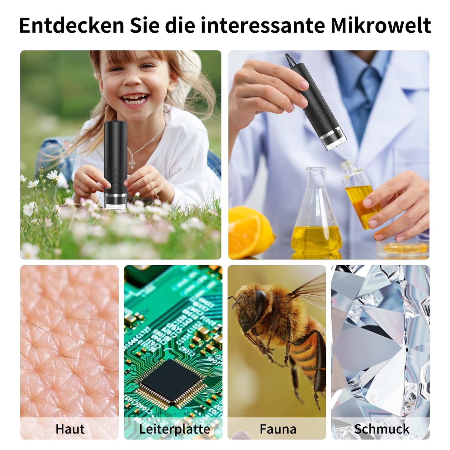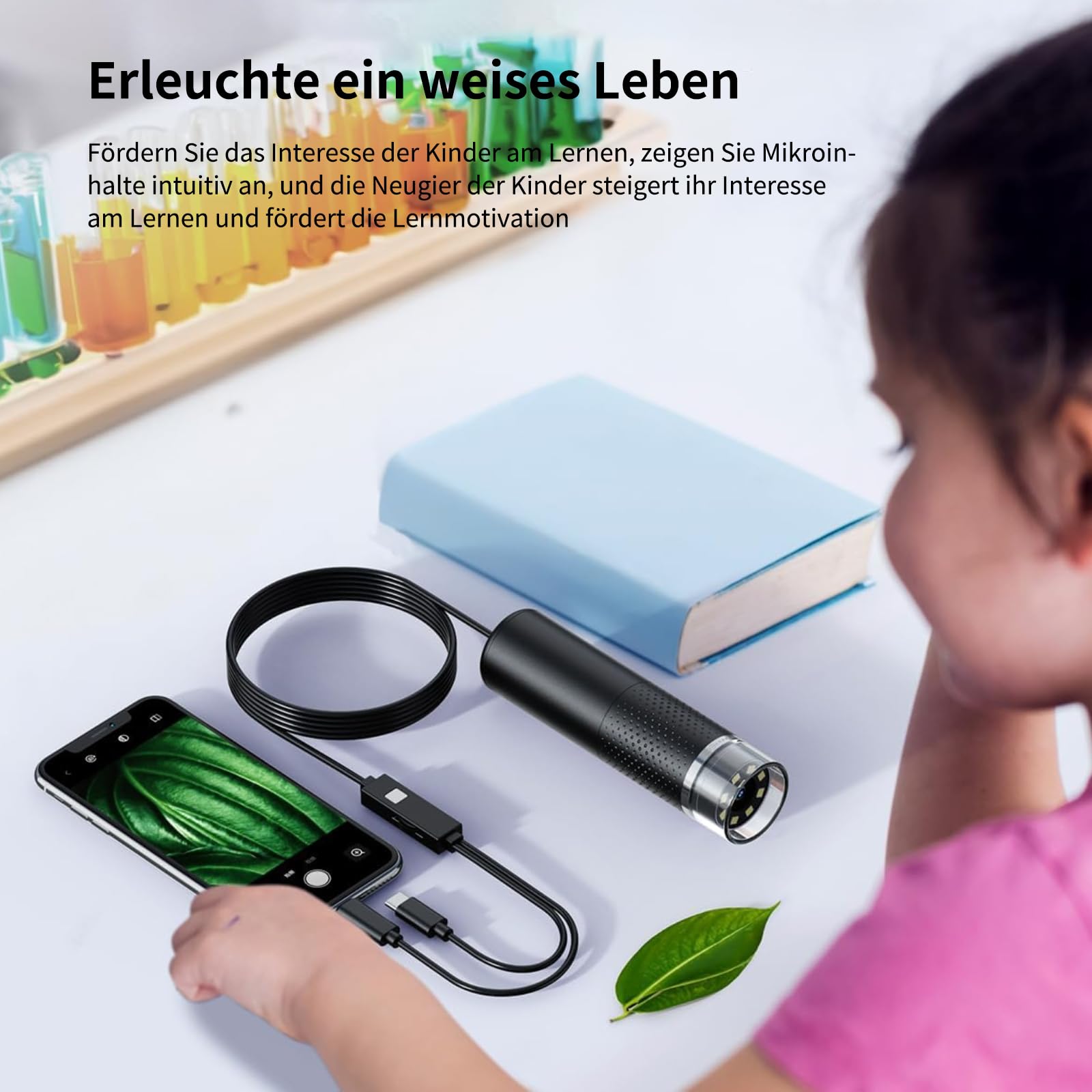 ["Upgraded 10X-200X Digital Magnification: Handy microscope with +2MP camera based on its 1080P image and video resolution. This allows you to view the smallest details of the sample, such as plants, coins, diamonds, welding, etc. Rely on 8 adjustable LEDs to provide sufficient illumination even in the dark.", "Portable pocket microscope: Mini size makes the microscope a very handy and fun tool to always have with you on nature walks. No charge is required for this. To obtain high-quality images, make sure your device has at least 20% battery.", "Available for Android and iOS: 1. Download the software 'Sup-Anesok' from Google Play or the APP Store. 2. Connect the USB cable to your phone and return to the app. This will open up the world of microscopy for you. A WIFI connection is not required, avoiding frustrating connection problems. Compatible with Android 7.0+ (OTG function/USB-C) and iOS 10.0+.", "Fields & Scenarios: This electronic microscope is more of a fixed-focus magnifying glass, not a traditional microscope, not suitable for professional serious biologists! Education purposes, hair, skin, jewelry, gemstones, coins, electronics, textiles, printing, PCB, etc.", "Package list: a digital microscope with 4.92FT cable with iOS and USB Type C connections for smartphones and tablets, user manual. Not compatible with laptops or desktops."]