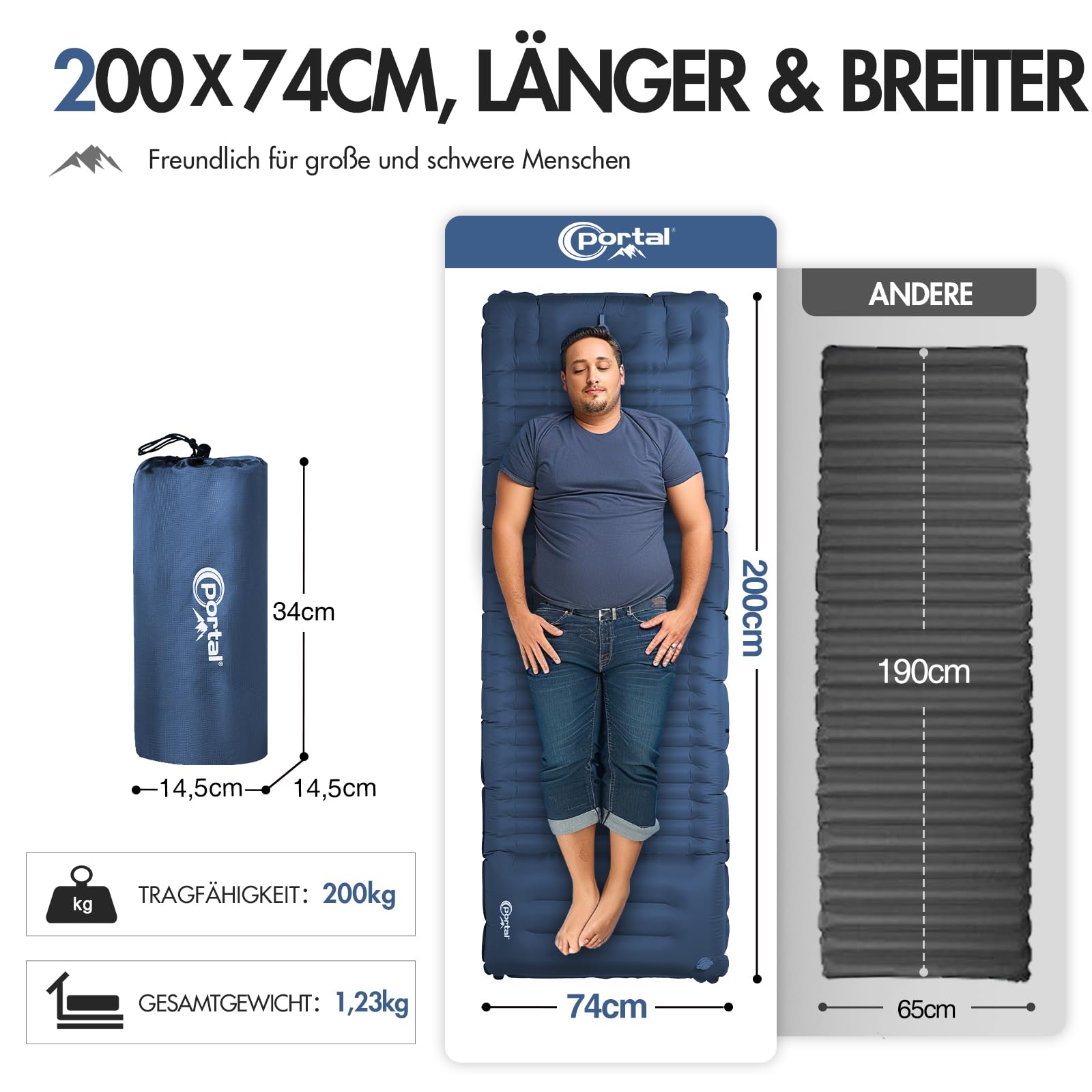 PORTAL Camping Self-Inflating Sleeping Pad 10cm Thick Air Mattress Ultra-light with Foot Pump 18cm Thick Pillow Inflatable Mattress Outdoor Foldable Sleeping Mat 200*74cm for Camping Hiking Travel