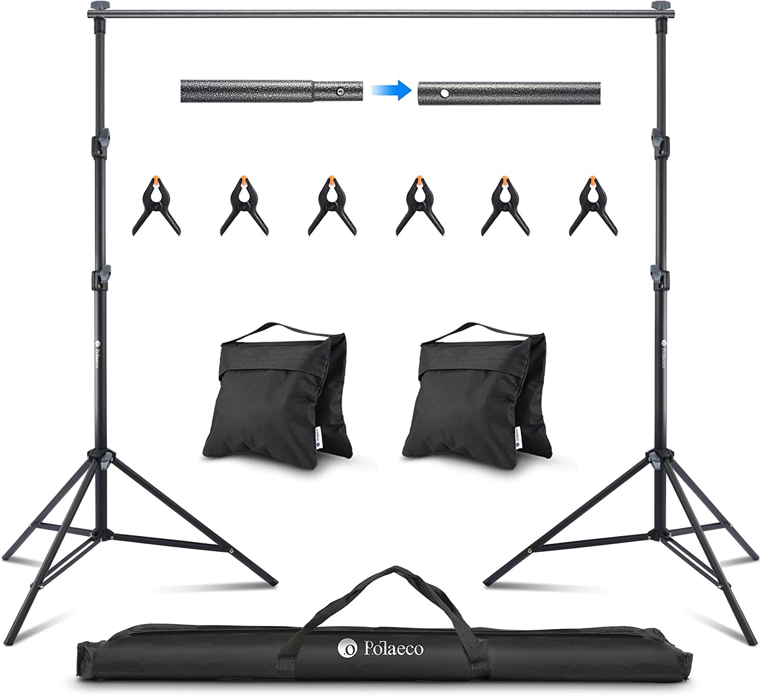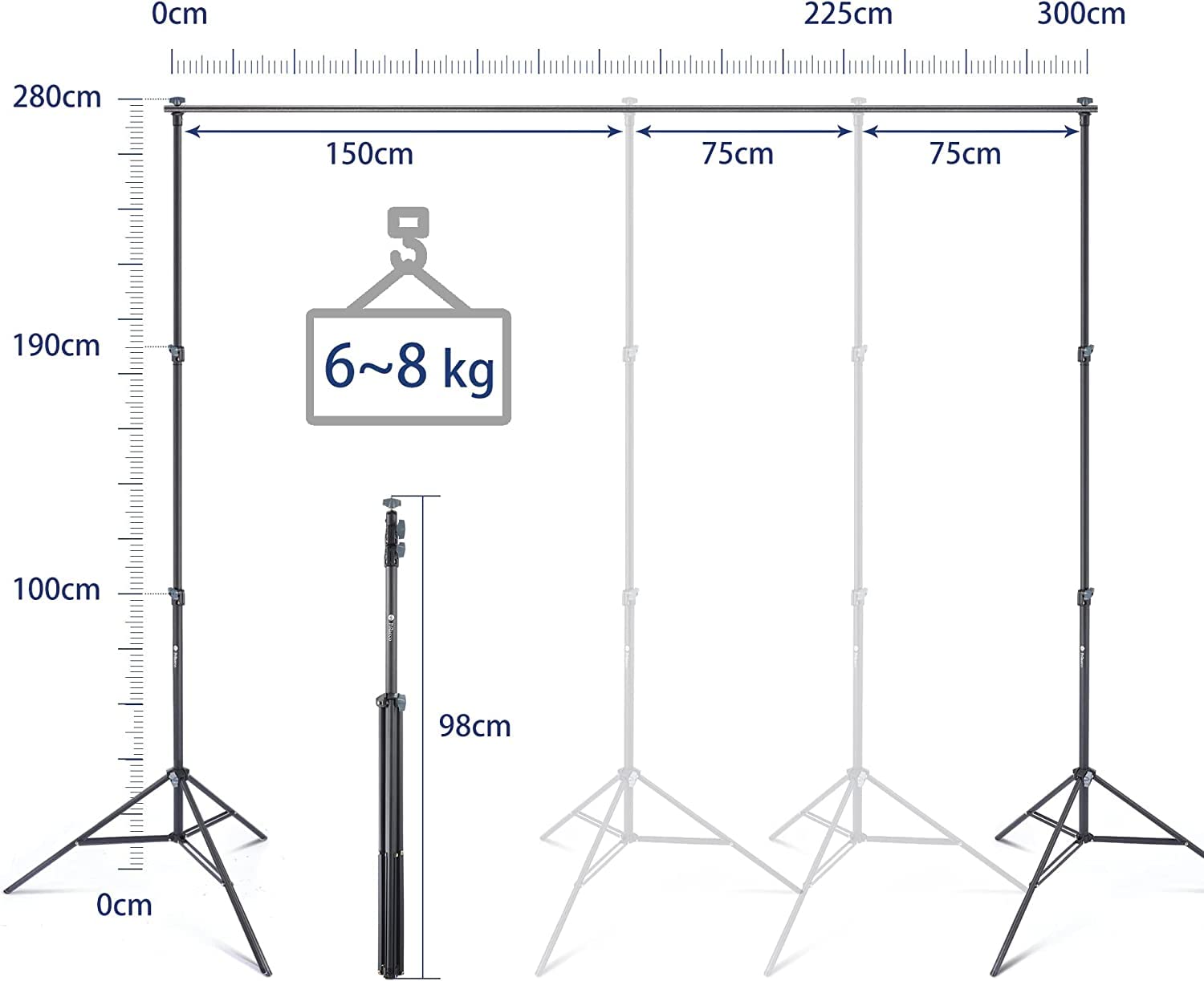 ["Stabilized Background Support System】Weight 9.3 lbs, the material is stronger than others. The improved matte treadle is made of cold-rolled hard steel material and a painting process. The diameter of the tube is thickened, ensuring longer durability, increasing stability and slip resistance; The knob is made of reinforced nylon, which is pressure-resistant and not easily damaged during use.","Adjustable Background Stand】Super easy to use, whether for indoor or outdoor activities, our stands can meet your needs. The width and height of the background stand can be adjusted by the telescopic top crossbar and stand. Adjust the height (from 45.3" to 110.2") and width (from 59.1" to 118.1").","Easy to Use, Carry, and Store】Without tools, one person can easily set up and take down the background stand in 5 minutes. The entire background support set can be folded up to fit into the included carrying bag. It is very space-saving to store and very easy to transport.","Wide Applications】This photo background system is perfect for families and photo studios. It can be used for various purposes such as photography, YouTube videos, live streaming, home studio, party, wedding, business events as a stable shelf, or for any special occasion. It is a great photo tool for amateur and professional photographers.","Package & Customer Service】2x stands, 4x crossbars, 6x spring clamps, 2x sandbags (empty), 1x carrying bag. If you have any questions about the background stand kit, feel free to contact us. We will assist you within 24 hours."]