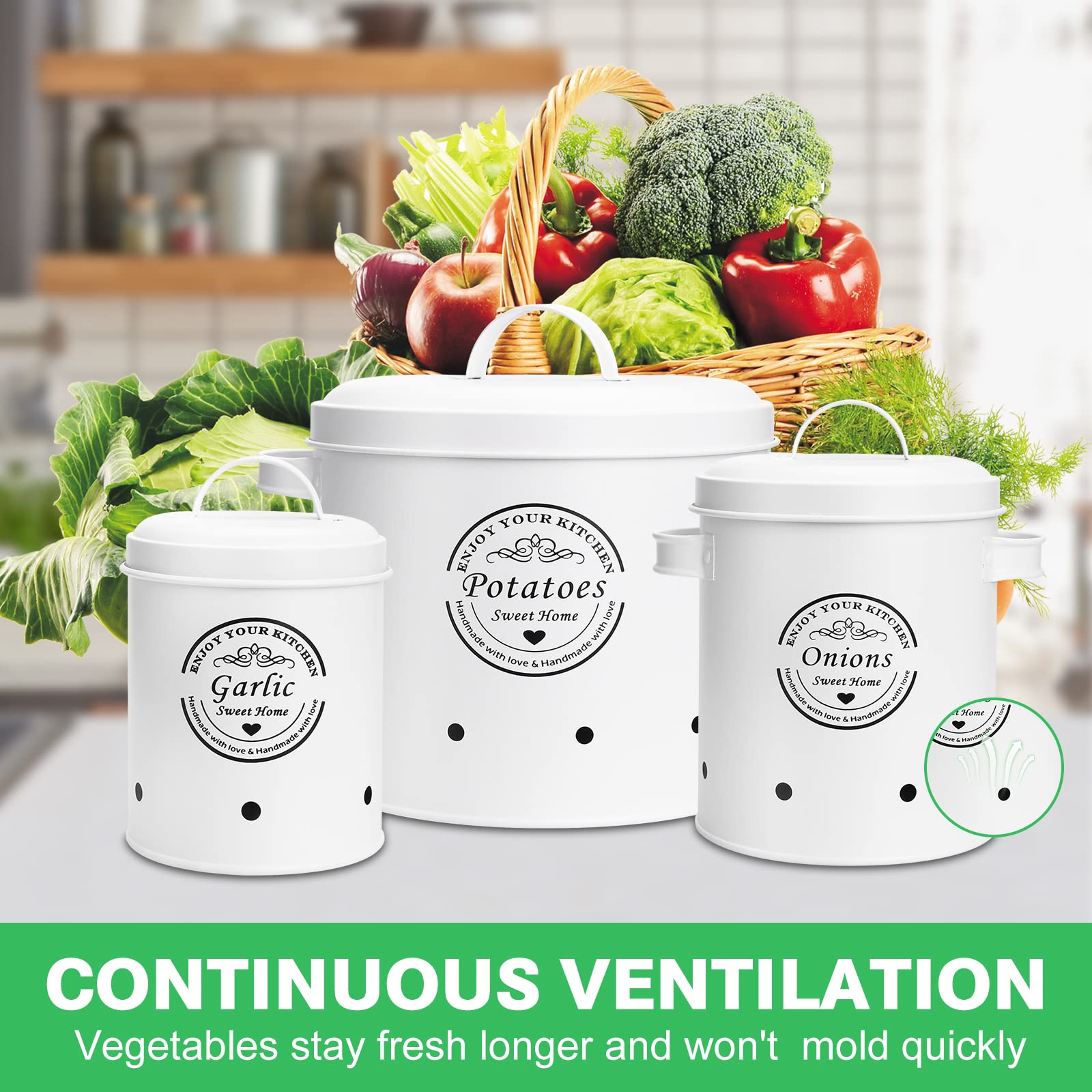 Potato storage box set of 3 on the stove, onion pot and garlic pot ventilated storage container set, onion storage, storage potatoes onions garlic storage (white)