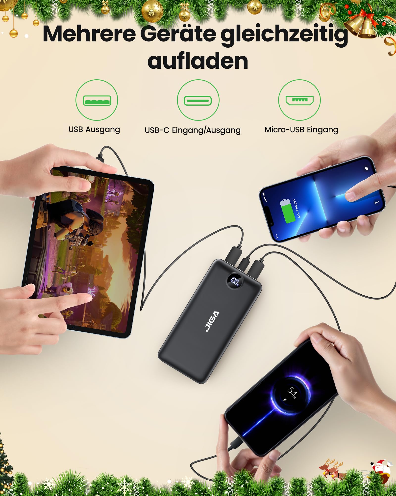["【Expert in Fast Charging】 Portable power bank with the latest 22.5W power and PD20W fast charging technology can charge two phones to 61% in just 30 minutes, the time it takes to enjoy a cup of coffee.","【High Capacity】 With a super capacity, this power bank can charge your phone at least 3-5 times, making it ideal for my family's charging needs.","【3 Output Ports & 2 Input Interfaces】 External battery pack has 2 x 22.5W USB-A outputs and 1 x 20W TYPE-C output, it can charge 3 devices simultaneously. Suitable for business, travel, and going out.","【Universal Compatibility】 Mobile battery pack widely compatible with iPhone, Huawei, Samsung, Google Pixel, Xiaomi smartphones, and other devices like headphones, fitness trackers, smartwatches, gopro cameras, and more.","【Intelligent Circuit】 A precise digital display is mounted on the portable charger, making it easy to see how much energy is left. The fast charging function ensures that the power bank can be charged safely and quickly."]