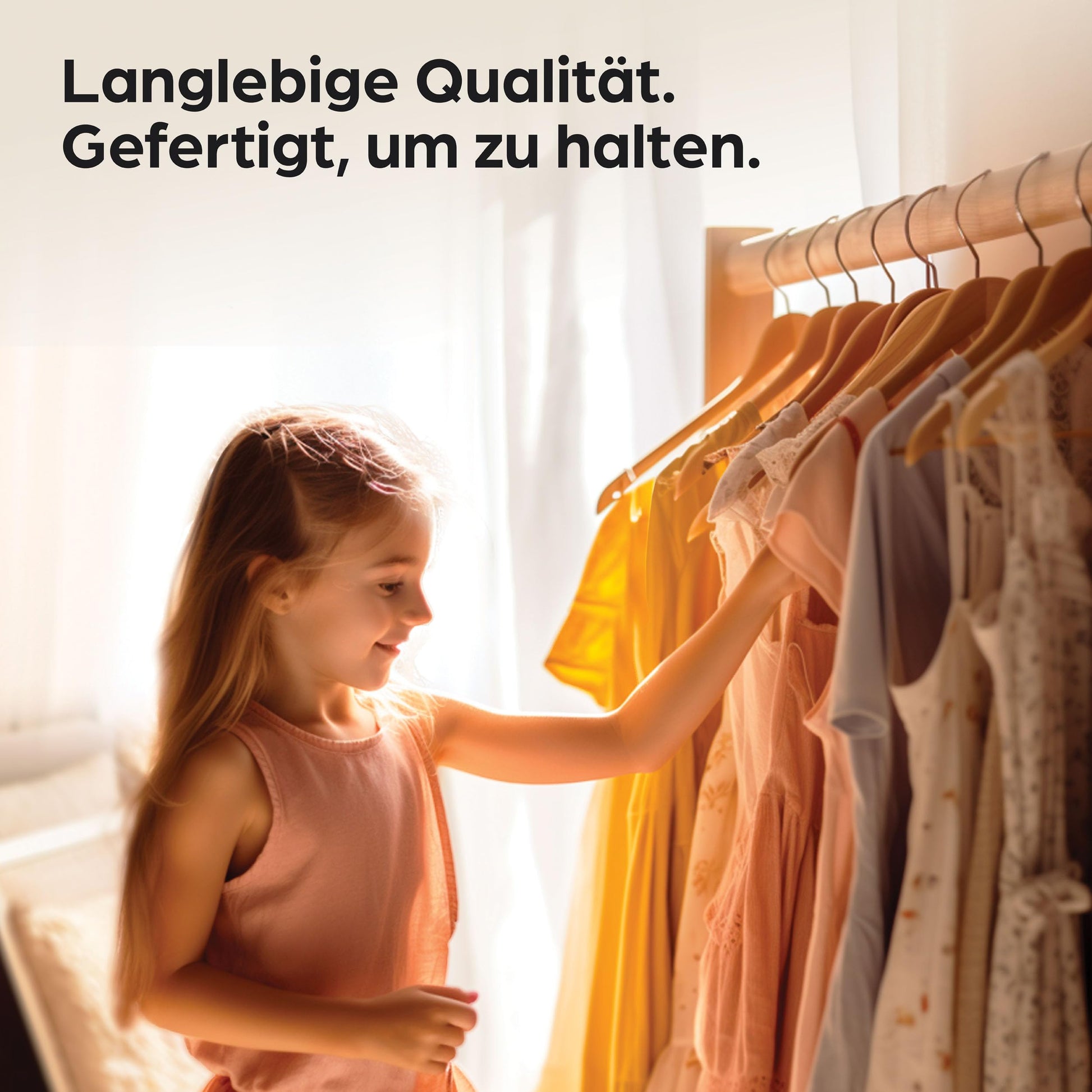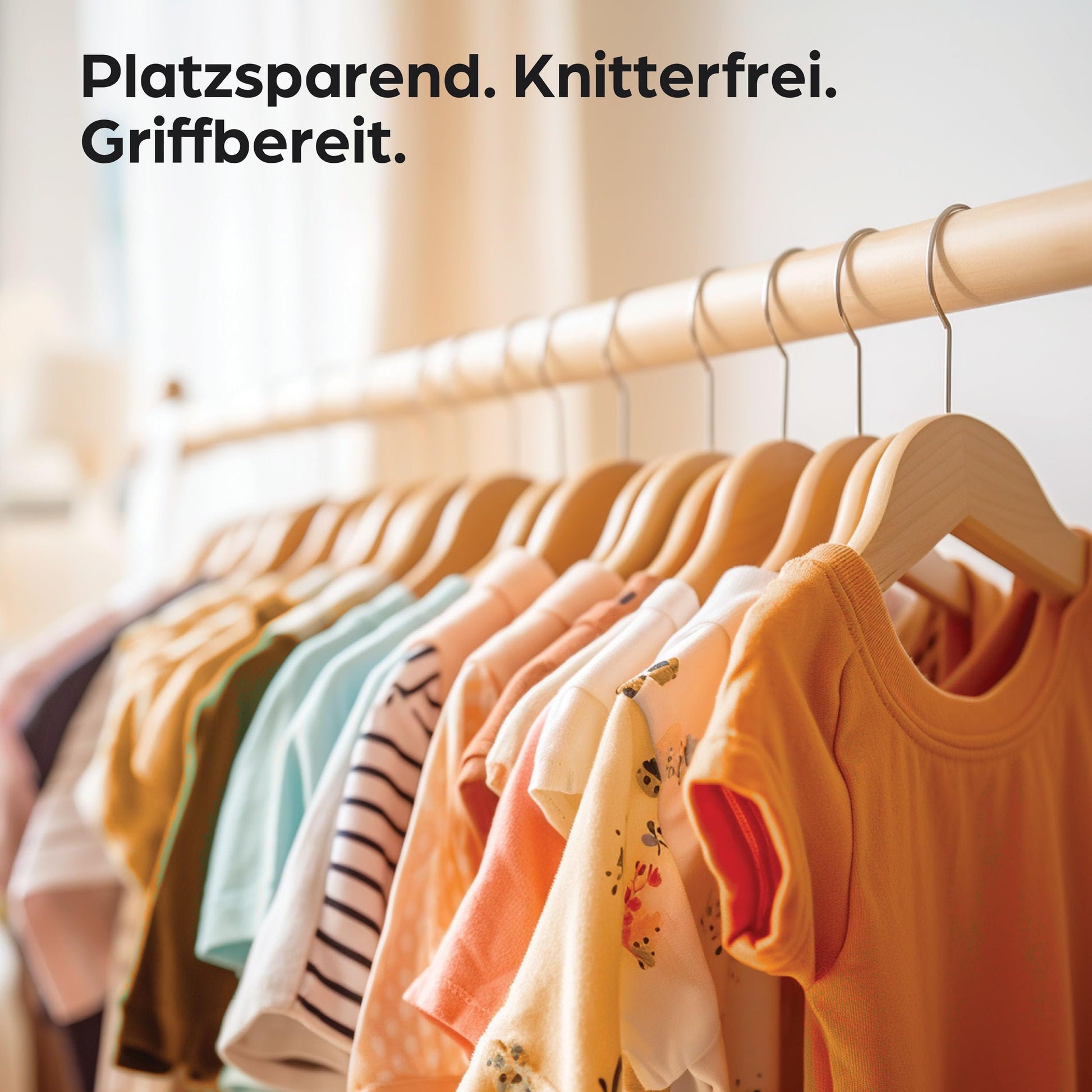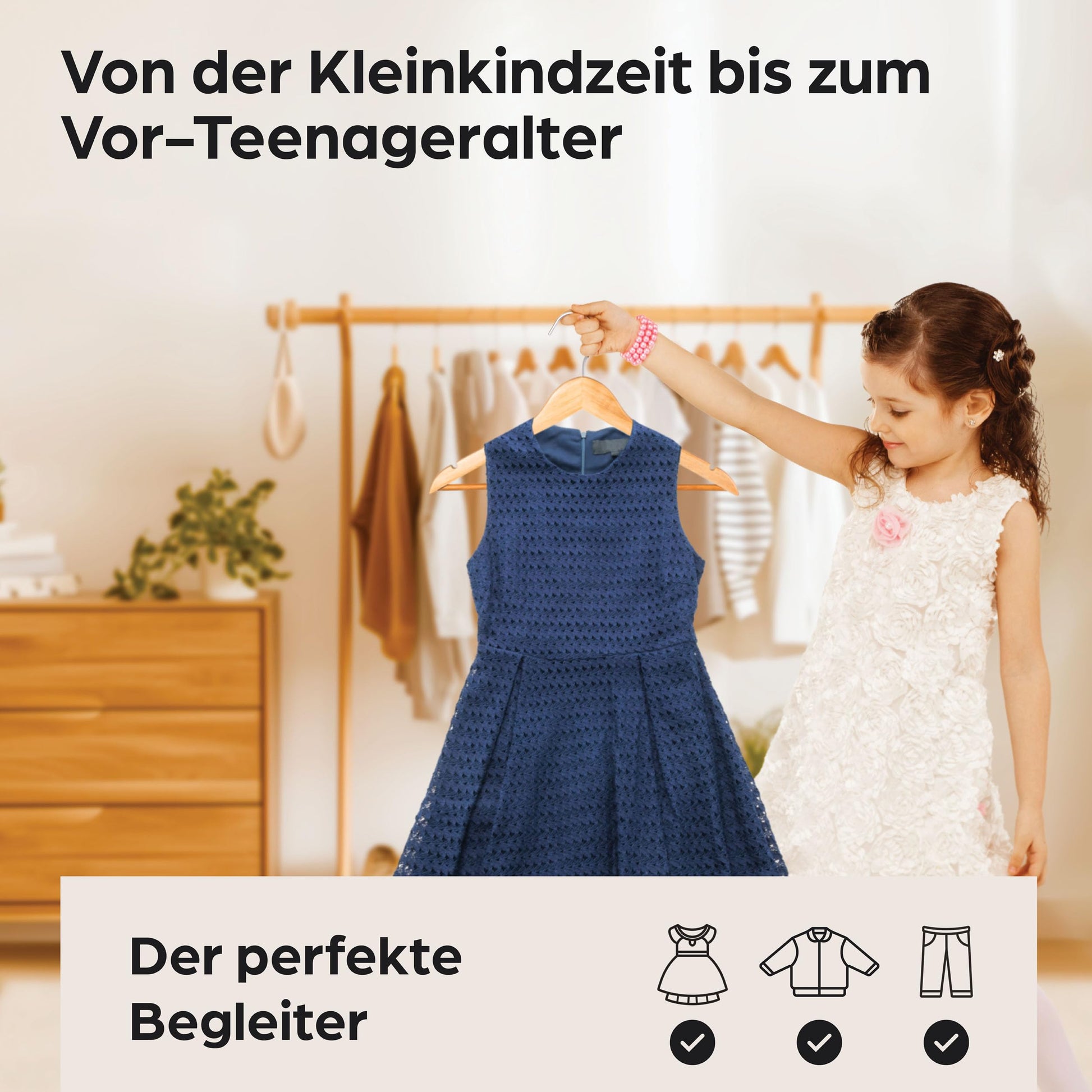 ["🪵 STYLISH ORGANIZATION: Organize your little one's clothes with our high-quality wooden children's hangers. An aesthetic eye-catcher in the wardrobe for toddler clothing!", "🪵 SPACE-SAVING & FUNCTIONAL: Save valuable space in the wardrobe thanks to the slim design. The sturdy hangers keep children's clothing safe, wrinkle-free, and well-organized!", "🪵 VERSATILE USAGE: Perfect for baby and toddler clothing. Use them for dresses, pants, shirts, and more. A practical set for any child's room.", "🪵 DURABLE QUALITY: Made from high-quality wood and free from sharp edges, our children's hangers offer long-lasting performance. Quality that lasts.", "🪵 SUSTAINABLE ALTERNATIVE: Hangers made from wood, free from harmful chemicals and completely plastic-free packaging. A sustainable choice for a plastic-free future."]