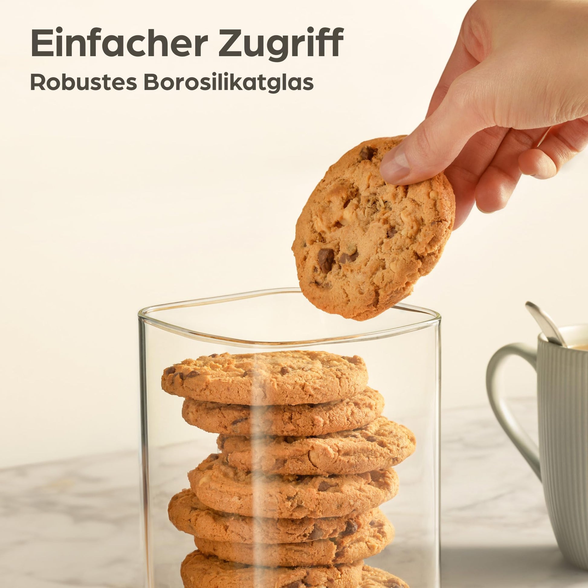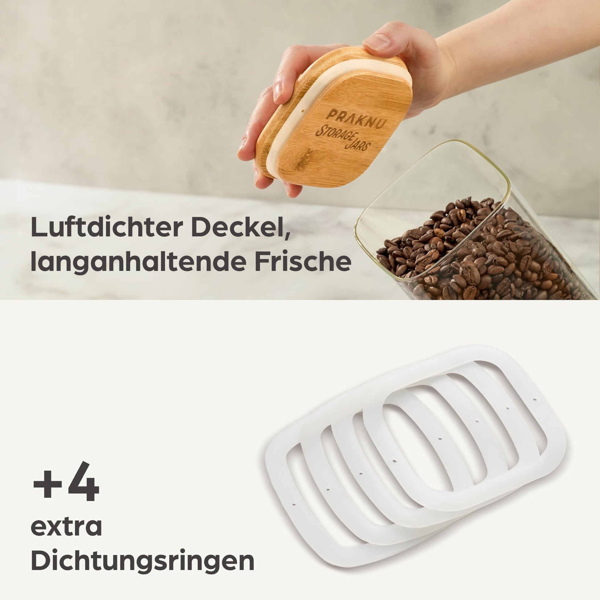["SPACE-SAVING & STACKABLE: Our square storage jars in two sizes - 8" x 4" (50 oz) and 4" x 4" (24 oz) - are easily stackable and provide stylish organization in the kitchen.","AIRTIGHT: The bamboo lids with silicone seal ensure an airtight closure and isolate odors. This keeps flour, pasta, cereal, coffee, cookies, nuts, or tea fresh and aromatic for longer.","VERSATILE STORAGE CONTAINER SET: Ideal for a variety of dry goods, from cereal to baking ingredients, in two convenient sizes - 2 x 50 oz and 2 x 24 oz - suitable for any kitchen shelf.","HYGIENIC GLASS: Our storage jars made of borosilicate glass are heat-resistant, dishwasher safe, and guaranteed mothproof. Food-safe and flavor-neutral for pure aromas.","COMPLETE KITCHEN SET: A 4-piece glass storage jar set with bamboo lids and 4 additional seals provides a complete solution for stylish and effective storage in the kitchen."]
