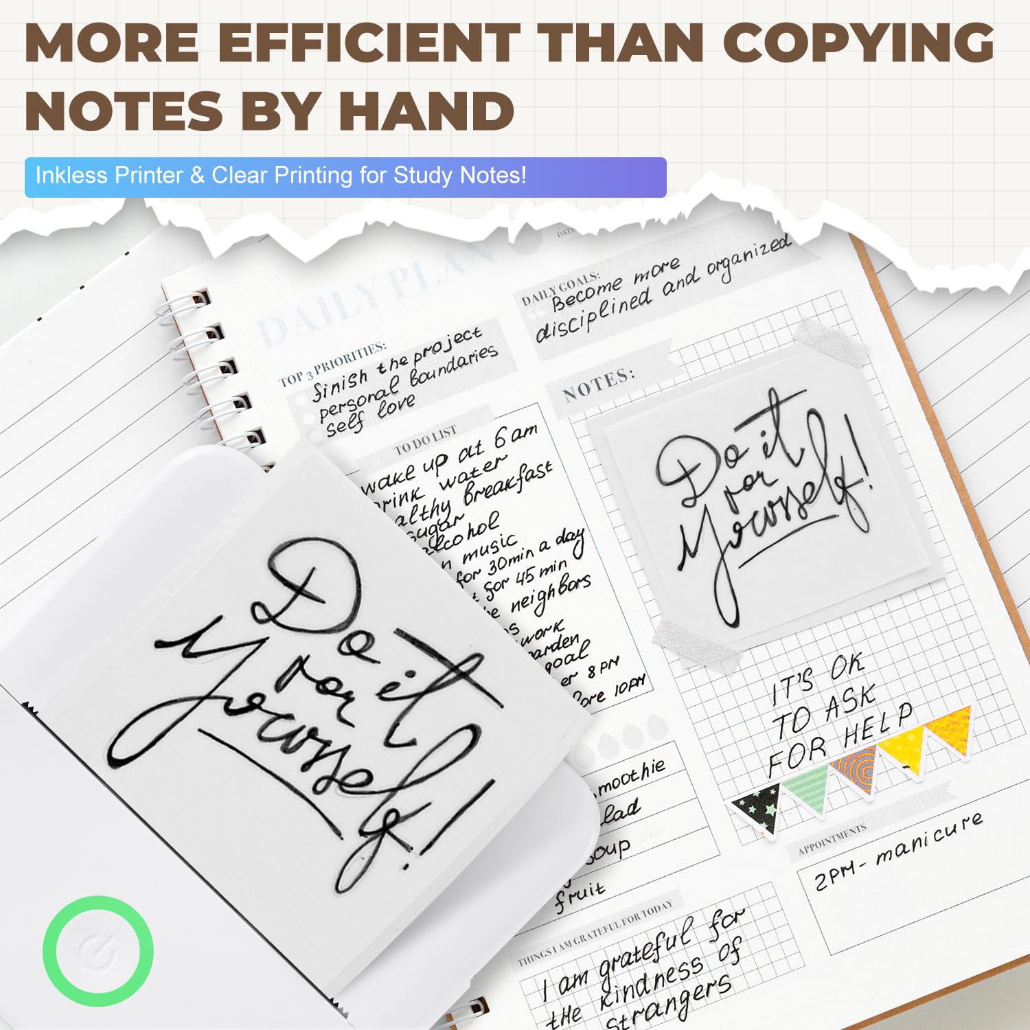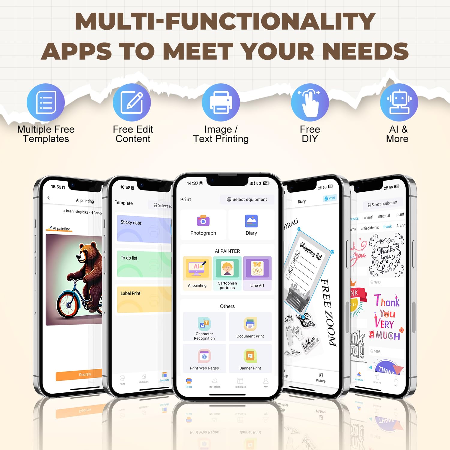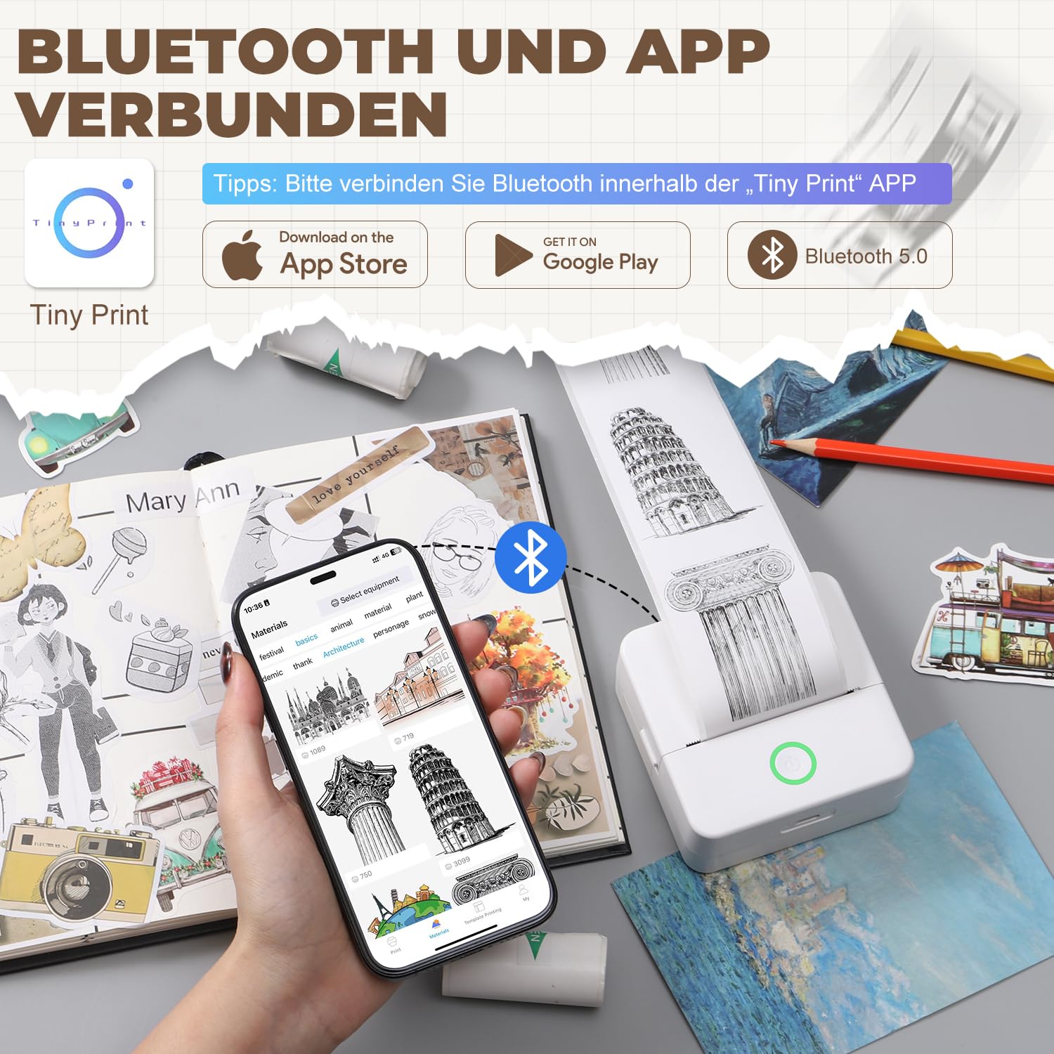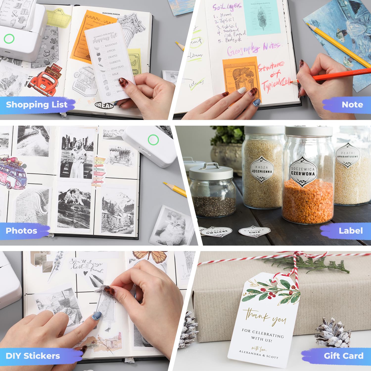 ["Customized Thermal Inkless Printer: The inkless sticker printer uses thermal printing technology and comes equipped with 5 rolls of sticker paper and 5 rolls of thermal printing paper, ink-free printing. The 2 inch wide thermal paper can be freely cut to length or shape as well as label size, allowing you to create your own sticker ideas anytime, anywhere (black and white only)", "Bluetooth One-Click Print App: The label printer uses the Bluetooth connection of the 'Tiny Print' app, no additional complicated operations are required, just follow the connection instructions to quickly connect to your smartphone. The app is equipped with free zoom and drag options, OCR functions, and stickers. Many templates, editing options, and text", "Long Battery Life and 200 DPI Resolution: The sticker maker has a built-in rechargeable 1200mAh high-density lithium-ion battery and 200 dpi high-resolution print image to protect children's eyes. Note: if the print is not clear after repeated use, you can wipe the printer's laser beam with alcohol (the laser beam is located in the paper tray)", "Compact and Portable Size: Mini thermal printer for phones, elegant and cute appearance, compact and lightweight housing size, can be carried in a school bag or purse, placed on a desk, office desk or in the kitchen without taking up space, you can record study notes or work plans at any time to meet your various printing needs", "Multifunctional Mini Printer: With the mini sticker printer, you can print black and white photos, images, study notes, to-do lists, shopping lists, etc., as well as customize bookmarks, labels, magazines, and greeting cards. The app includes a variety of templates and is compatible with Android 4.0 and IOS 9.0 or higher."]
