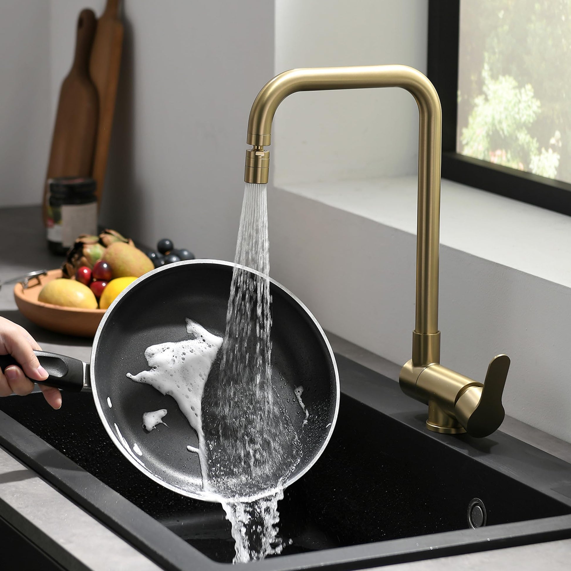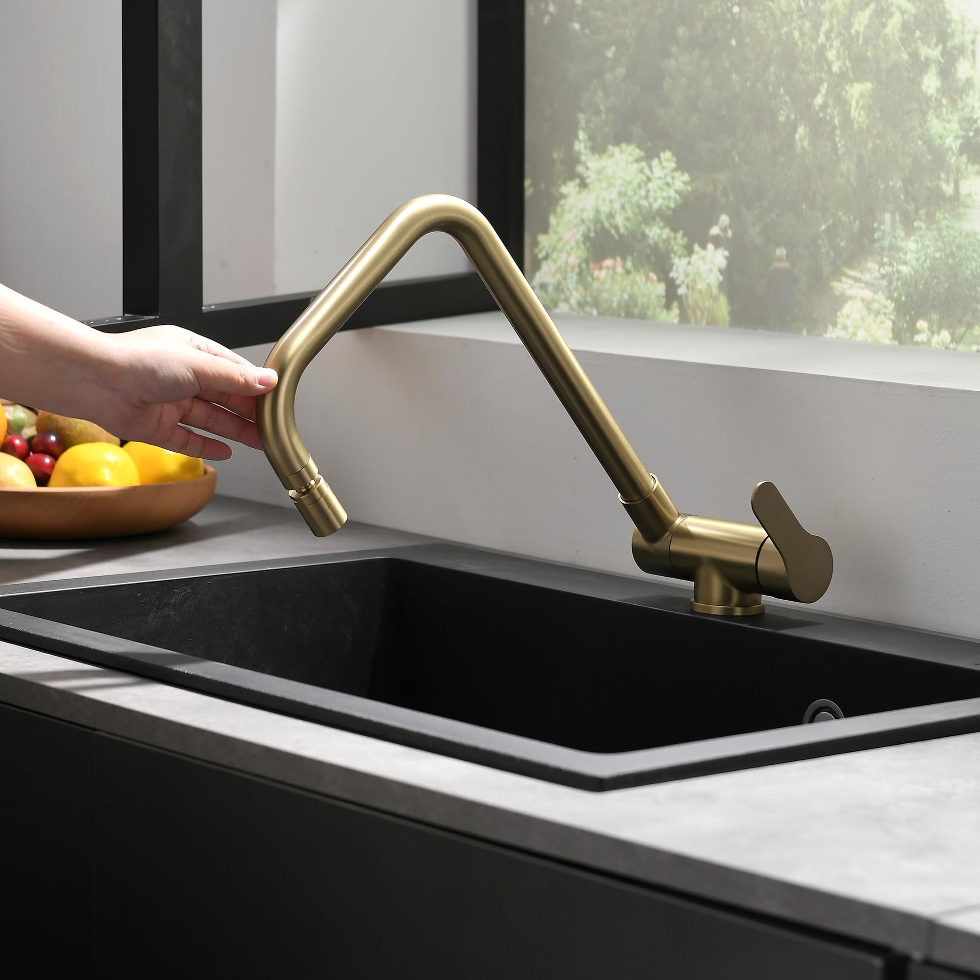 "Folding kitchen faucet, ideal for installation in kitchens where the sink is located under the window: allowing you to fold the faucet and comfortably open the window, Height after folding: 70 mm","Sprayer made of ABS plastic, soft water quality, no splashing, water-saving technology saves up to 30% on water bills. The sprayer fully mixes flowing water and air without reducing water pressure. The sprayer increases foam volume in water at the same flow rate","HIGH-QUALITY MATERIAL: Lead-free solid stainless steel with gold finish, corrosion and rust resistant material guarantees long-term use. Drip-free ceramic disc cartridge for smooth and durable operation","BRUSHED GOLD FINISH: The classic gold stainless steel finish can create a more elegant and refined look. It will not fade or tarnish over time and can be wonderfully combined with any kitchen decor","EASY TO INSTALL: Standard 1/2 inch water hoses fit most kitchen pipes. The faucet comes with an installation video tutorial, so you can install it with confidence."