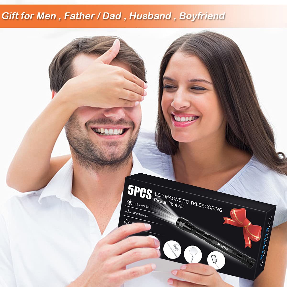 ["5-piece magnetic pickup tool set: Comes with 1 piece 15 lb magnetic pickup tool, 1 piece 1 lb magnetic pickup tool, 1 round inspection mirror, 1 square inspection mirror, and 1 flexible extendable LED flashlight.","Telescoping handle: The 15 lb pickup tool can telescope from 6.7 to 30 inches, while the 1 lb pickup tool can range from 5 to 25 inches. The round inspection mirror can extend from 3.7 to 7.7 inches, while the square inspection mirror can range from 11.4 to 34.3 inches. And the telescoping flexible LED flashlights can extend from 6.6 inches to 22.8 inches.","360° rotating adjustable design: The LED flashlights and the round/square inspection mirrors are 360-degree swivel. They are practical for your daily use and help you pick up items easily.","Equipped with LED lights: The flexible flashlights come with 3 LED lights, and the square inspection mirror comes with 2 LED lights.","Wide application: This 5-piece magnetic pickup tool set can be used to locate metal nuts, bolts, screws, and other metal parts. Easily retrieve nails, parts, and debris behind HVAC equipment, cabinets, automotive parts, workbenches, etc.","Gift for men, Christmas gift must-have stocking filler"]