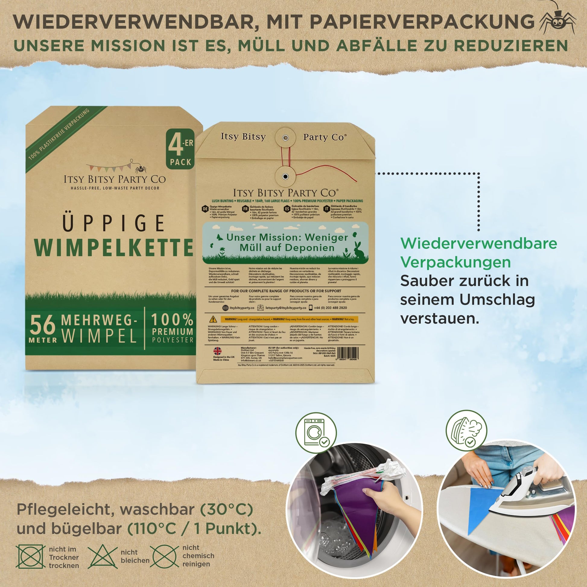 THE DETAILS - 56m (4 x 14m) long, with long ends that can easily be tied around trees or fence posts. 168 large flags (30x20cm) in 7 vibrant and double-sided colors. Easy to care for, washable (30°C), and ironable (110°C / 1 dot).