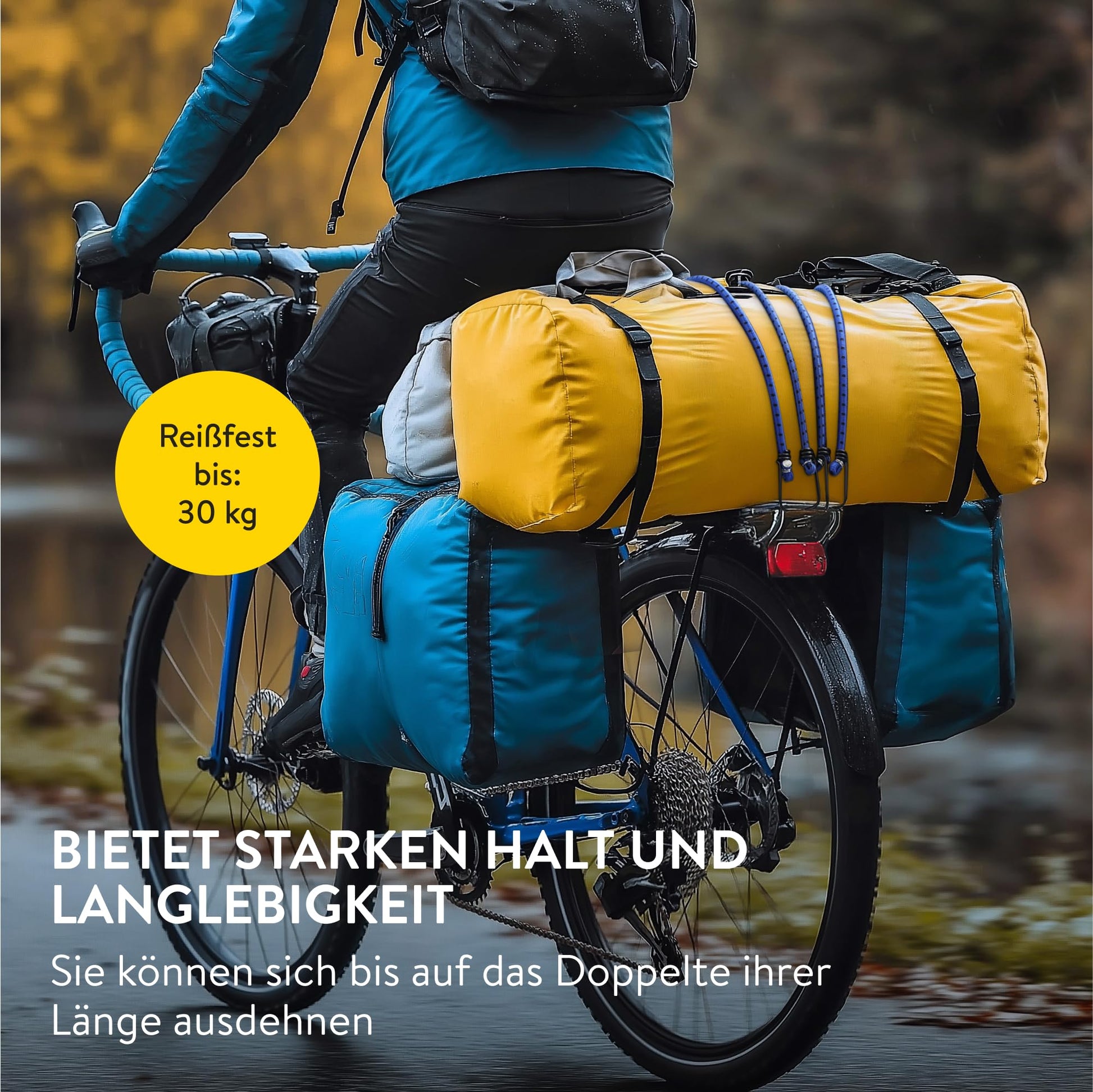 "Bicycle bungee cord with strength: The bungee-style rubber straps have impressive strength and can be used versatilely for securing cargo of all kinds, luggage, and tarps.