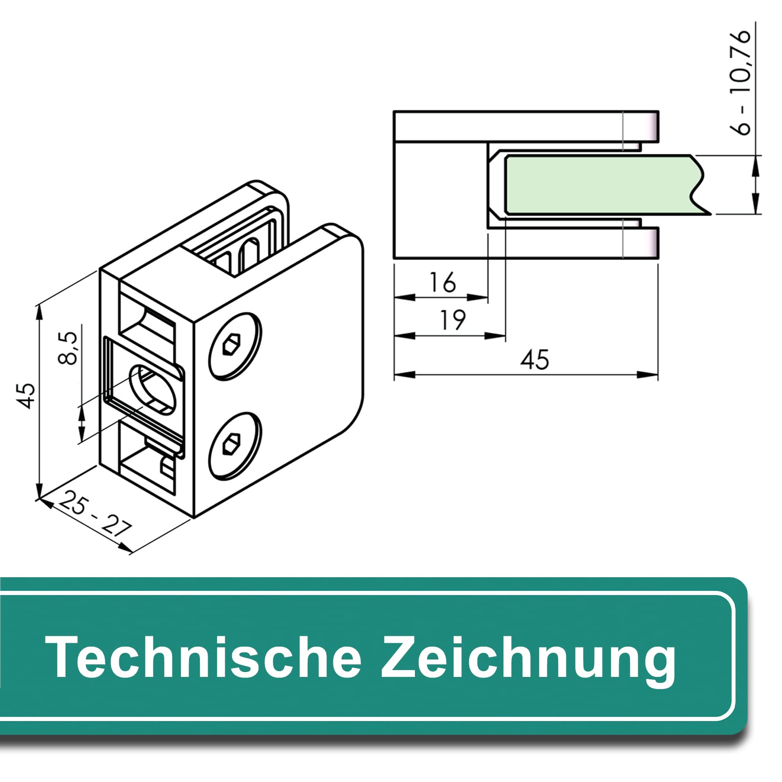 PRIOstahl glass holder glass clamps spacer holder clamp holder - 4 pieces 45 x 45 x 26 mm Connection: Flat for glass 6.76 mm glass clamp holder glass panel holder for railings stainless steel V2A.