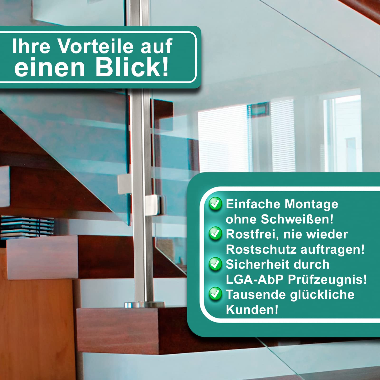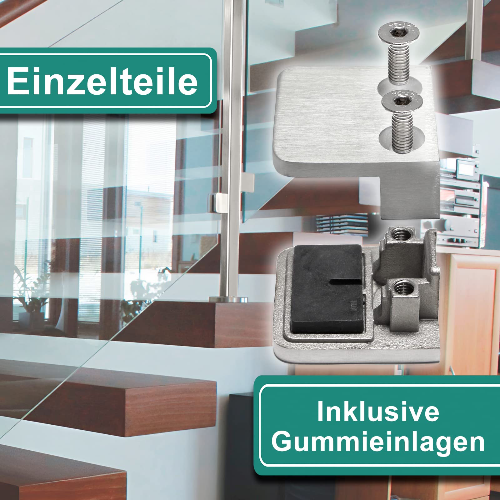 EASY INSTALLATION: Unscrew the 2 screws of the glass clamps and remove the screwed-on cover part, Mount all 4 holders on the railing posts through the provided hole and align the holders. Now insert the rubber inserts into the holder on both sides. Now insert the glass pane and clamp it with the removed part of the bracket. Make sure that all clamping parts are securely tightened before releasing the pane.