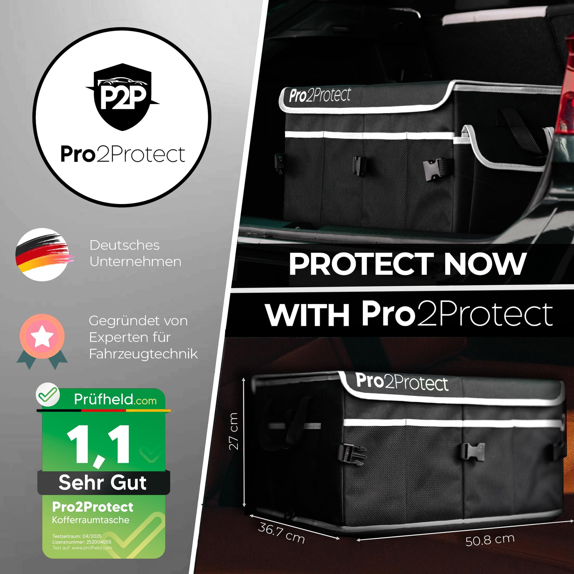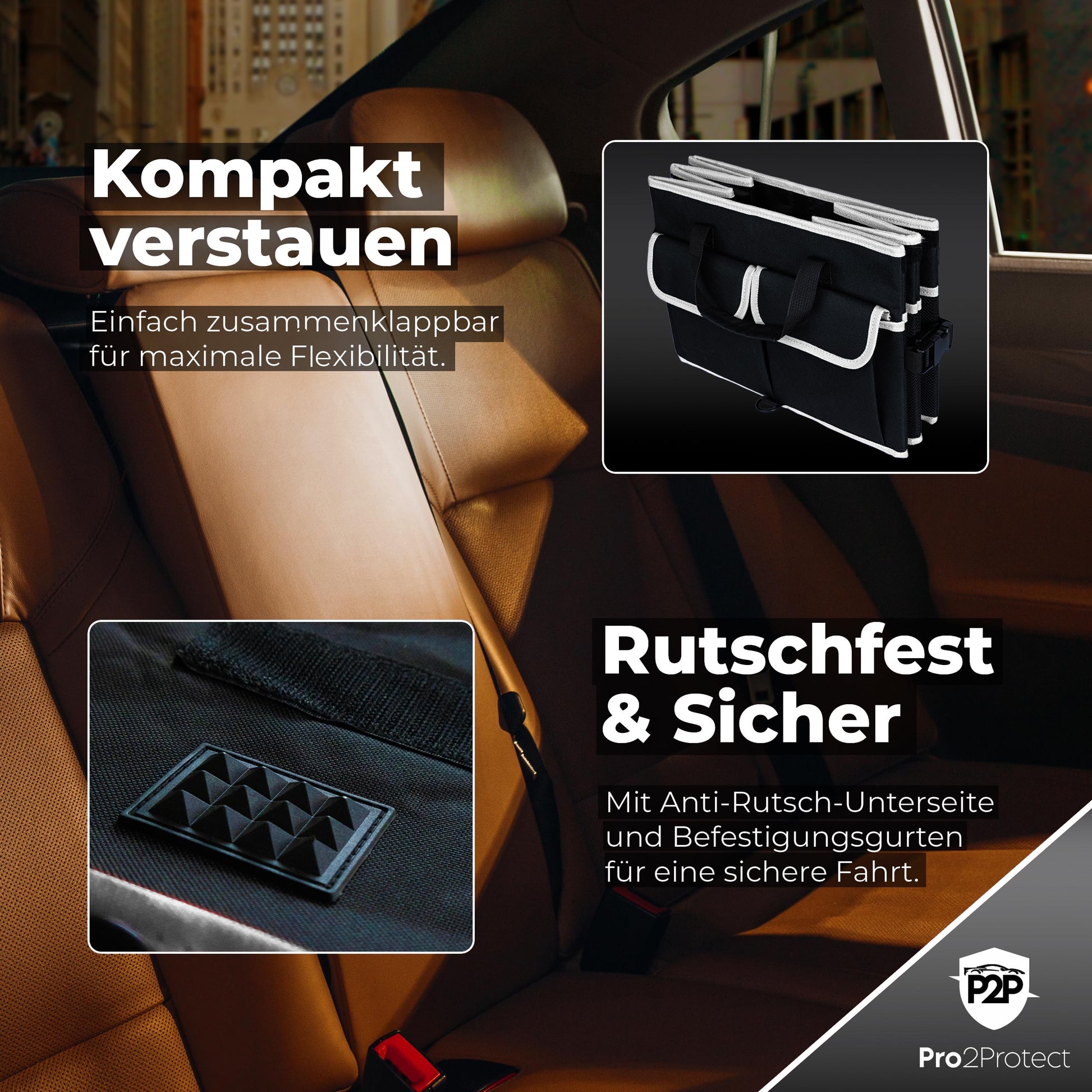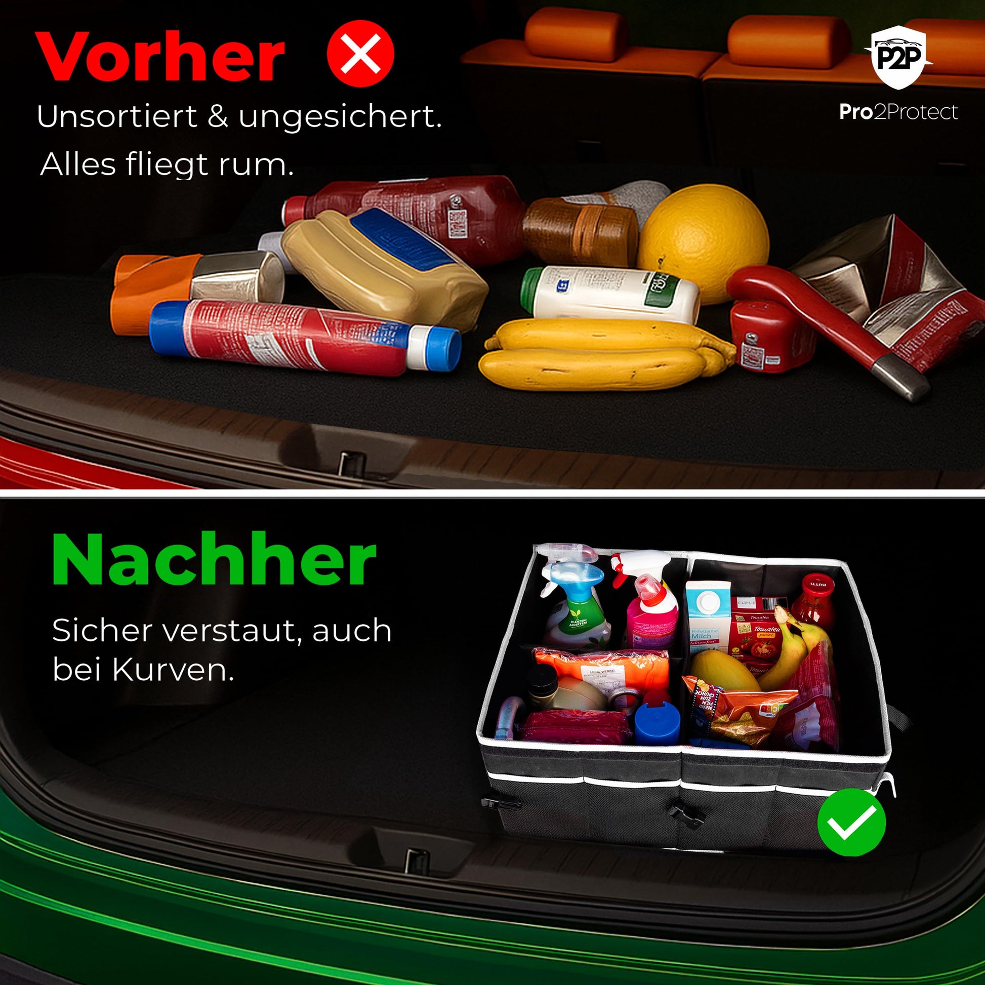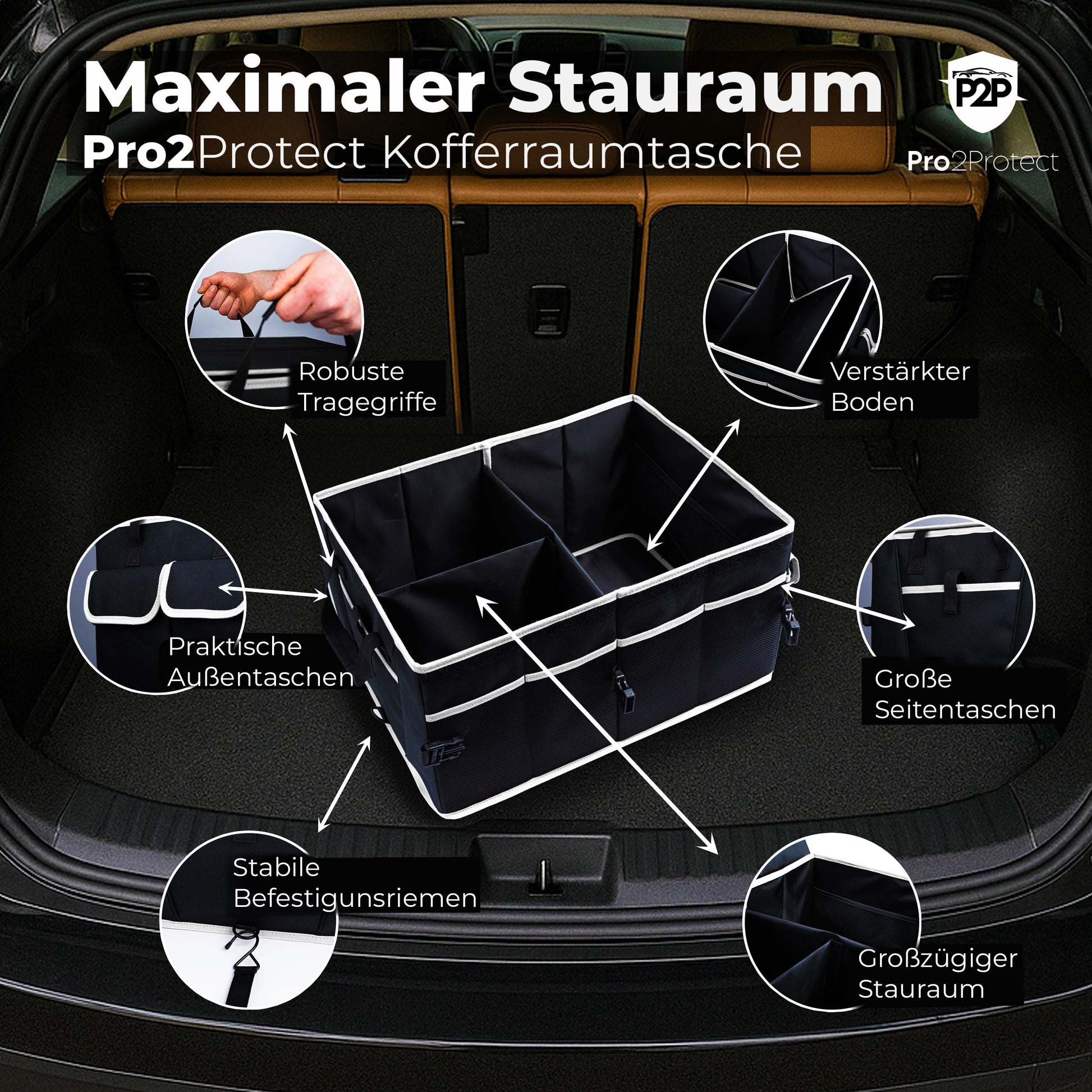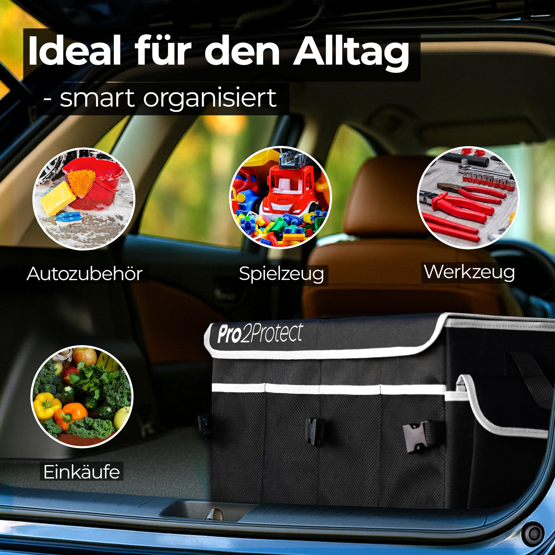 ["✅ 2x SEHR GUT GETESTET | The Pro2Protect trunk bag impresses with excellent quality: In two independent tests, it was rated “EXCELLENT” with a grade of 1.1 (Prüfheld.com, 04.2025, license number 252004055 and Warentest-online.de, license number 20251508, 05.2025). High-quality materials, thoughtful design, and reliable workmanship make the difference. If you are looking for a sturdy, durable, and tested car organizer solution, this bag is the ideal choice for you.","✅ NON-SLIP & SAFE | Safety is our top priority: Thanks to the non-slip bottom and two sturdy fastening straps, the car accessory trunk remains securely in place even during spirited driving. No slipping, no tipping over – even during strong braking maneuvers. Your items are always securely stowed, whether you are driving through curves or suddenly have to brake. This keeps your trunk neat, protected, and organized.","✅ MAXIMUM STORAGE SPACE 20" x 14.5" x 10" | With generous dimensions, the storage box XXL / Box Organizer offers plenty of storage space for tools, cleaning supplies, groceries, or sports equipment. The organizer with lid / collapsible box with lid is ideal for daily use as well as longer car trips or vacations. With a thoughtful design featuring separate compartments and sturdy walls, everything stays in place – for order and clarity in every trunk.","✅ STURDY, THOUGHTFUL & WITH PRACTICAL POCKETS | The Pro2Protect car trunk bag / foldable bag impresses with durable materials, a reinforced bottom, and sturdy handles – ideal for daily use. In addition, several exterior pockets provide quick access to smaller items such as flashlights, ice scrapers, or cleaning wipes. Everything stays safely stored, organized, and easily accessible – whether on trips, in everyday life, or at work.","✅ FLEXIBLE DIVIDERS | Internally flexible, externally stable – with removable dividers, you can customize the main compartment of the car storage box and cleanly separate different items. This ensures everything remains orderly and nothing slides around. Whether you want to use the bag for the car, shopping, or as mobile storage space – you decide how to optimally use the space.","✅ SPACE-SAVING STORAGE | If you don't need the trunk organizer / In-car organizer, it can be quickly folded flat and stored space-savingly. Perfect for those who want order in the car but also want to remain flexible. This keeps your trunk tidy. A clever system for those who want to combine function and flexibility.","✅ WATERPROOF & EASY TO CLEAN | The high-quality exterior material is water-repellent, dirt-resistant, and particularly easy to clean – ideal for any season. Whether muddy shoes, wet tools, or leaked bottles: Everything is quickly cleaned with a damp cloth. These car gadgets (car accessories interior) stay permanently maintained and still look great even after frequent use.","✅ FOR EVERY SITUATION | Whether in everyday life, shopping, sports, traveling, or in the working day – the Pro2Protect car storage box is the ideal companion. It not only offers plenty of space, but also structure and order for everything you need on the go. No rattling, no chaos – just well-organized storage space that you can rely on at all times. For families, artisans, and commuters.","✅ FOR ALL VEHICLES | Whether estate, SUV, van, or small car – the Pro2Protect Car Accessories Interior fits in almost any vehicle and ensures immediate order in the trunk. Ideal for everyday life, travel, or work. Compatible with brands like Alfa Romeo, Audi, BMW, Citroën, Dacia, Fiat, Ford, Honda, Hyundai, Mazda, Mercedes, Mitsubishi, Nissan, Opel, Peugeot, Renault, Seat, Skoda, Toyota, VW and many more.","✅ PRO2PROTECT | Developed by experienced experts from the automotive industry, Pro2Protect stands for the highest standards of function, design, and durability. Every detail of this trunk bag has been optimized for practical use. You will receive a well-thought-out premium product that makes everyday life in the car easier – developed with genuine expertise and manufactured with quality."]