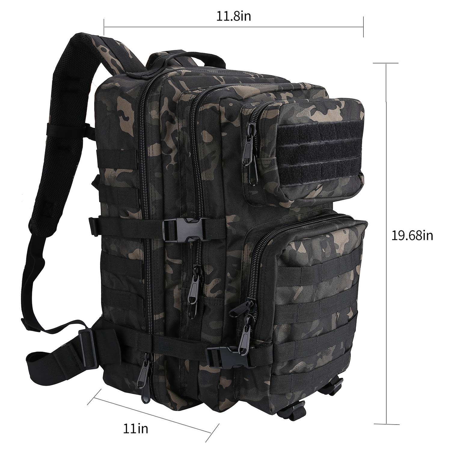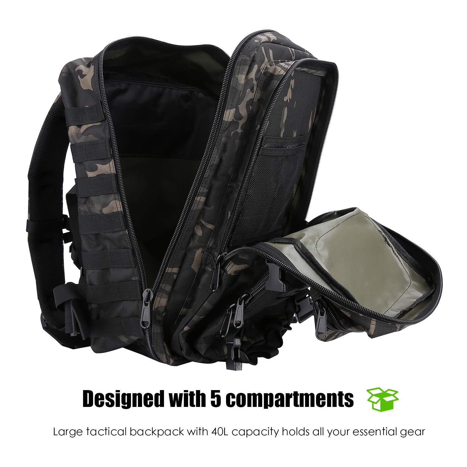 ["π‘οΈ Size: 19.68\"Γ11.8\"Γ11.8\" (approximately 50*30*30cm); The tactical backpack with large capacity is made of durable and water-resistant material, providing a clean and dry environment for your outdoor gear","π° This backpack is equipped with double stitched seams, sturdy zippers, breathable padded back, and functional compression system for space-saving deployments. Paying attention to every detail, ideal for all kinds of outdoor activities","π‘οΈ Designed with 5 compartments for different items: two front pockets for small items, two large compartments with integrated zipper pocket and mesh pocket for large and important accessories, a hidden back pocket for frequently used items","π° MOLLE System: Molle fabric throughout the bag for attaching additional pouches or gears like a 3-day assault pack; Could also be used as a bail-out bag, survival backpack, go bag, and range bag","π‘οΈ Quality shoulder strap with soft padding, comfortable and convenient to carry on your shoulders; Also designed with waist belt, easy to attach the bag to the hip, no worry about the bag slipping down when biking or climbing"]