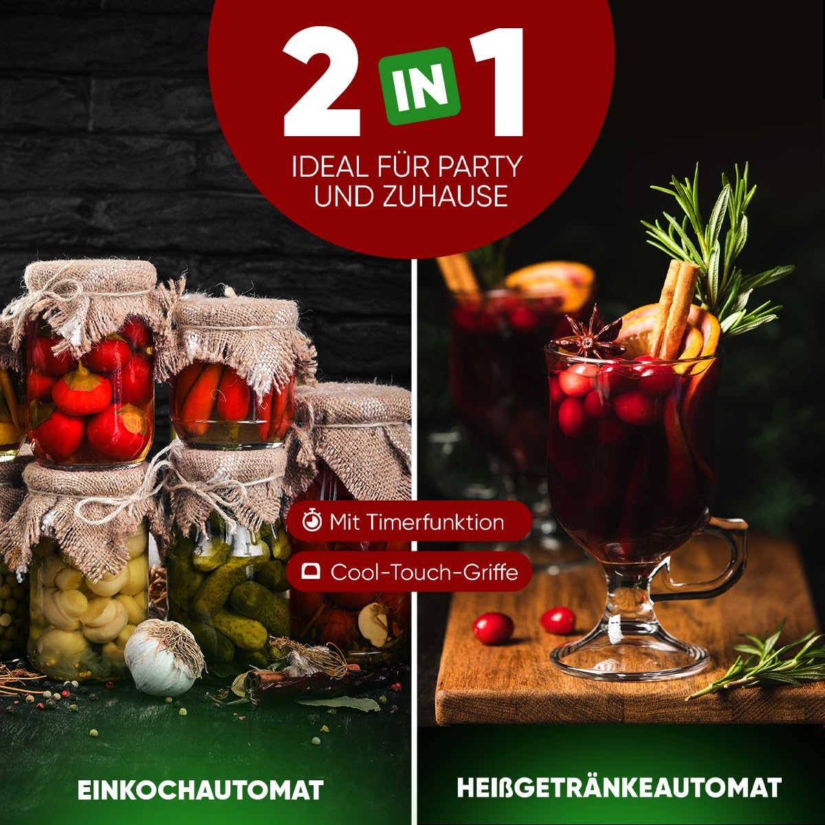 "Perfect for any season: The ProfiCook 2in1 Hot Beverage & Canning Machine allows you to prepare and keep delicious hot drinks like mulled wine, tea, and coffee all year round. At the same time, you can can fruits, vegetables, or jam to efficiently stock up your supplies."