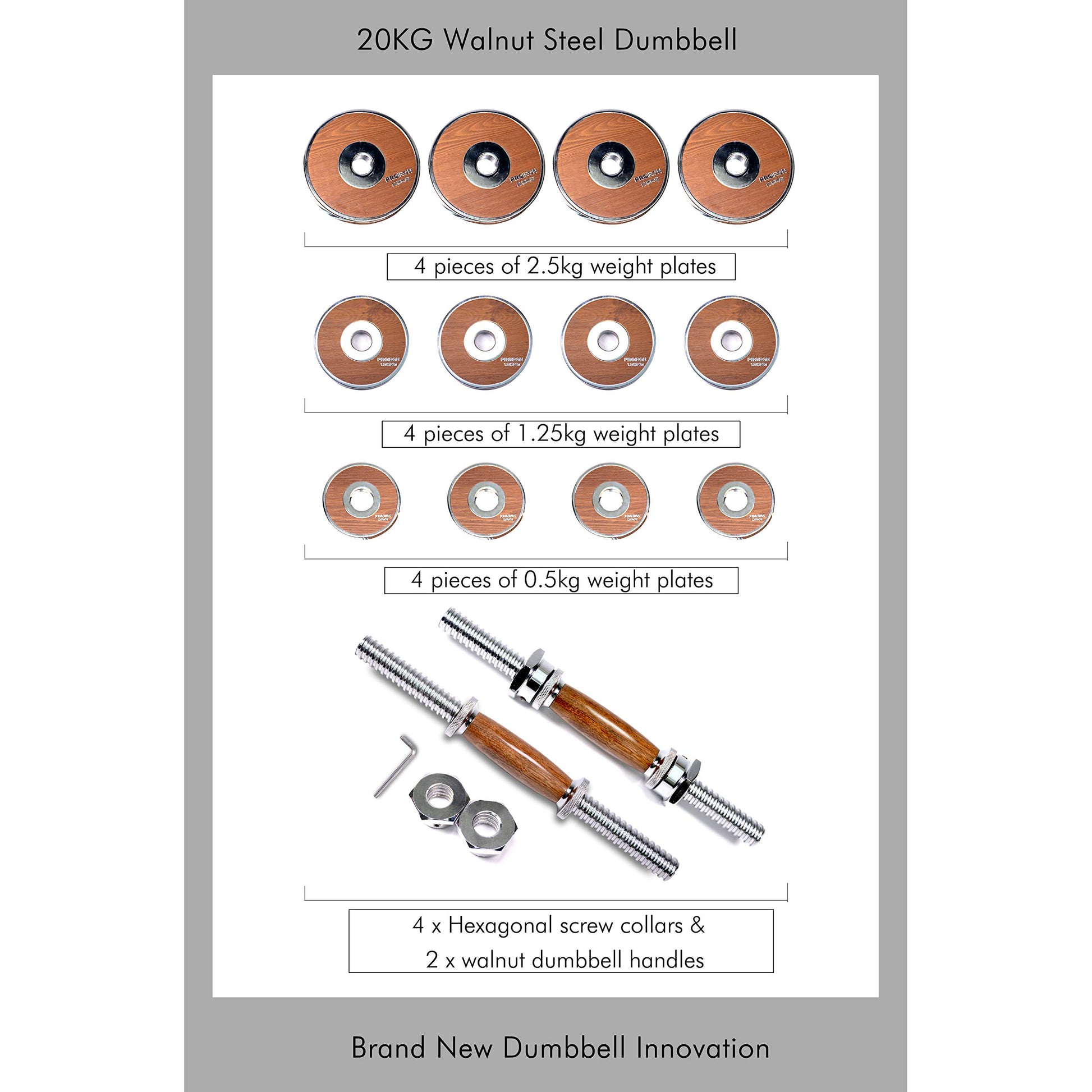 ["Innovative and unique design - this time we want to show you a very striking dumbbell. Best workmanship, original design, and the combination of art and strength - give it a try!", "Confident processes - 9 types of electroplating technology, 7 types of wood technology, and 3 times manual grinding. The solid steel spinlock collar with rubber ring is our unique double anti-loose design that securely holds the plates in place", "Adjustable and versatile - these quick-change, adjustable extension dumbbells offer precise adjustment and lots of control over your lifting grip, allowing you to expand your dumbbells from 5.5 lbs to 22 lbs each. Perfect for those with limited space and costing much less than a complete set of weights. Innovative adjustable dumbbells ensure you stay up to date with your fitness goals no matter how busy life gets", "Walnut wood handle - the handle is made from natural and eco-friendly walnut wood from the origin of the walnut. In our eyes, wood is a treasure that adds beauty to life. Walnut wood is an internationally valuable furniture and decorative material with high hardness, strong toughness, and corrosion resistance. Not only pleasant and gentle to the touch, but also solid and durable", "About this dumbbell - PROIRON has been a global provider of fitness equipment since 1997. We take responsibility for every product delivered, and top service is our brand philosophy. This dumbbell embodies the efforts of our research and development team from design to production and reflects our thinking on fitness. Sports can also be artistic! We hope everyone can stay fit and enjoy the happiness of fitness, which is our original intention"]