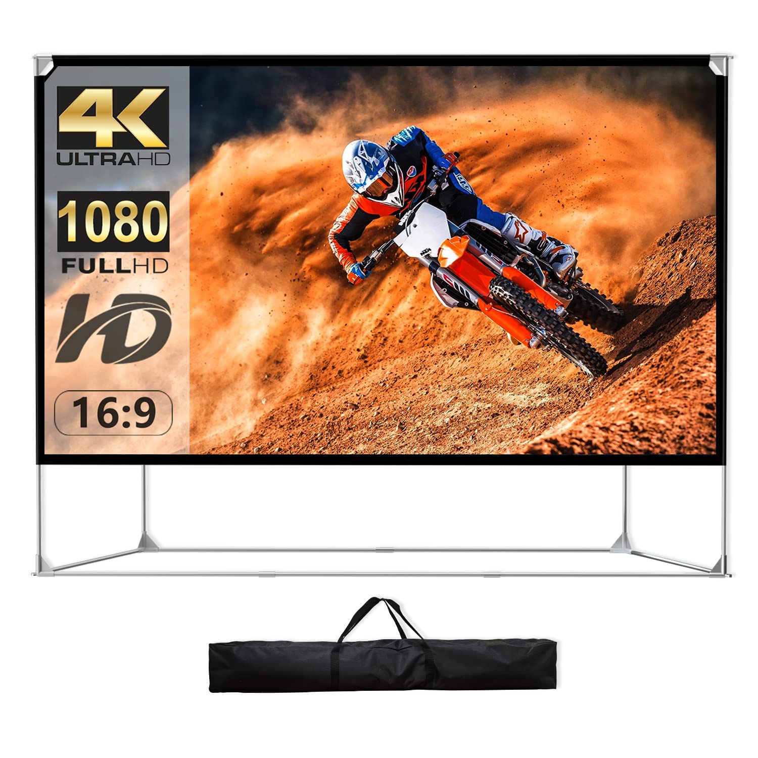 Projection screen with stand 150 inch Portable screen Projector 16:9 HD 4K Premium wrinkle-free screen Stand with carrying bag for home theater Indoor Outdoor projector movie screen.