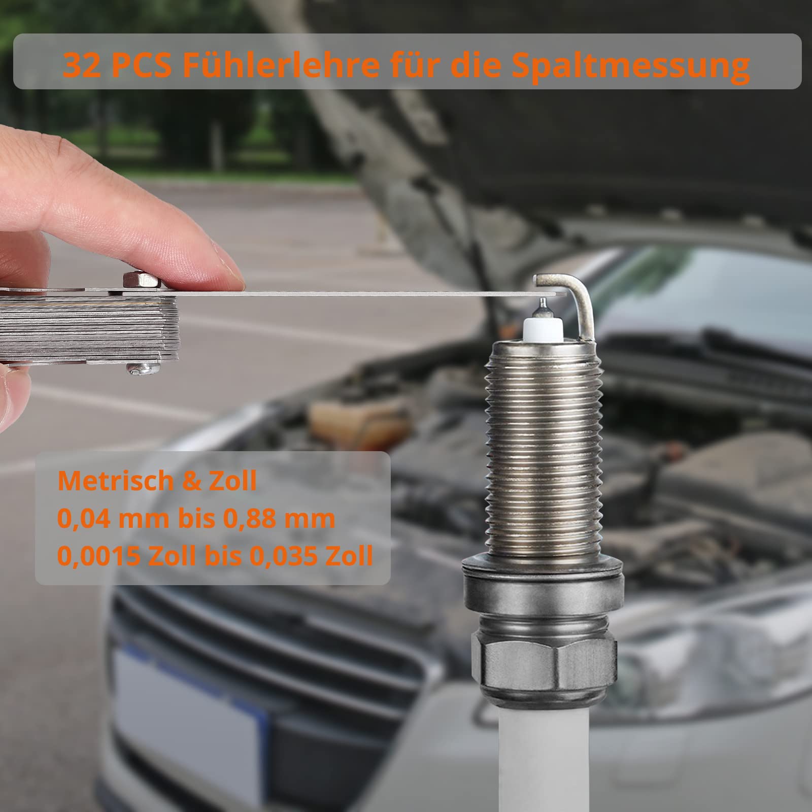 "【Feeler Gauge】 --- The feeler gauge also features 32 PCS blades made of 65 manganese steel, measuring range is 0.0015 inch / 0.04 mm to 0.035 inch / 0.88 mm, ensuring precision and accuracy in measurement.",