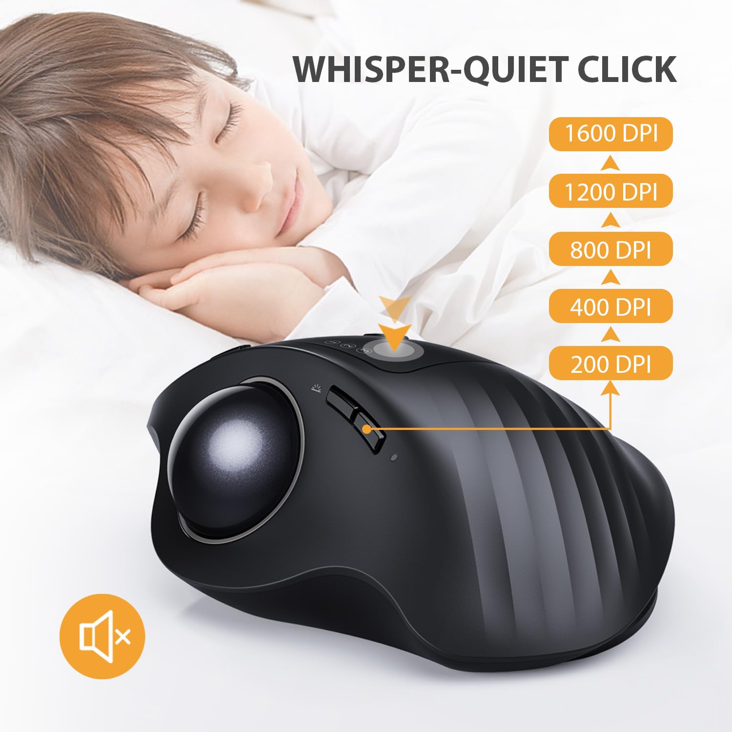 ["Ergonomic Trackball Mouse: With the smooth and precise rollerball mouse, you no longer have to move your arm to move the cursor. Instead, your thumb controls the cursor. It effectively reduces fatigue and strain on your wrist and arm. Note: All buttons are not programmable. The backward and forward button is not fully compatible with MAC devices and browsers like Safari", "Adjustable Angle Design: The unique adjustable hinge allows you to adjust the trackball angle from 0 to 20 degrees to suit your needs for a more natural, comfortable hand position and less muscle strain", "4 RGB Lighting Modes: You can set 4 RGB color effects with one button. Rainbow streaming light (default), rainbow breathing light, neon, color mixing breathing light. NOTE: The RGB backlight can also be turned off by long-pressing the light button to save battery power for the mouse", "Rechargeable & Adjustable DPI: The Bluetooth RGB Trackball Mouse is equipped with a 900mAh lithium battery. Batteries do not need to be replaced. It can last 1 month without RGB backlighting per full charge. Please remember to turn it off when not in use for an extended period of time. With 5 DPI levels (200/400/800/1200/1600 DPI), you can easily change the cursor sensitivity", "Bluetooth and 2.4G Wireless Connection: PLUG and PLAY. Type A USB receiver is not located on the back of the mouse, but in another small inner package. This trackball mouse features triple connection modes. You can control three devices simultaneously and freely switch between Android, tablet, and Mac with just one button. Compatible with Windows, Android, Mac OS PC Laptop Desktop, etc.", "Note: You can download the user manual and FAQ on the detail page (Product guides and documents)"]