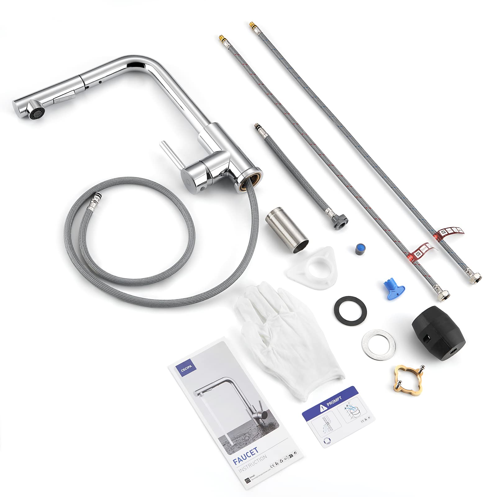 ["FLEXIBLE USE: The pull-out kitchen faucet can extend up to 40 cm, allowing you to clean every corner of the sink and use the water from a distance. The mixer tap can rotate 360 degrees with one hand, suitable for single and double sinks. The "L" shaped kitchen sink faucet not only increases kitchen flexibility, but also provides space for larger cookware, such as an asparagus pot.","MULTIFUNCTIONAL SINK FAUCET: This pull-out kitchen faucet has 2 spray modes, saving up to 40% water. The classic water flow is soft, while the shower water can effectively wash away dirt on dishes. The kitchen faucet uses an ABS bubbler, and the package includes a disassembly tool for easy removal and regular cleaning of the aerator.","MATERIALS: The kitchen faucet is made of 304 stainless steel, easy to clean, with a chrome surface that will appeal to the understated home cook. Our kitchen faucet can control hot and cold water with a single button. The high-performance ceramic valve ensures easy and precise adjustment of water flow and temperature, anti-aging, high pressure resistance, and no dripping.","HOSE: CECIPA Kitchen Faucet comes with two hot and cold water inlet pipes with a length of 600 mm and a 3/8-inch nut, complying with the international water inlet pipe standard. The recommended diameter of the faucet installation hole is 35-38mm. In addition, there is another fixed triangular plate that can be used when your plate is less than 20 mm, effectively preventing faucet wobbling.","PACKAGE CONTENTS: 1 × kitchen faucet, 1 × gravity ball, 2 × inlet pipe, 1 × tool for removing the aerator, 1 × install gloves, 1 × manual included. Easy installation of kitchen faucet with sprayer even without a plumber. We provide you with an installation video. If you have any questions, you can contact us anytime. We will reply within 24 hours."]
