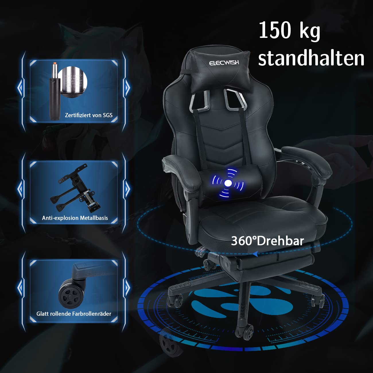 ["[Massage function]: This gaming chair features a USB massage function. Padded adjustable headrest and massage lumbar pillow for active support and relaxation. The Gaming Chair can hold up to 330 lbs.","[Excellent Quality]: Our chair uses an iron frame. It is stronger compared to wood steel frames. Memory foam is used for the cushion, so it is not easily deformed. PU leather is very skin-friendly. The wheels are also wrapped in PU leather, so they won't scratch your floor.","[Adjustable]: The backrest is adjustable between 90 and 150 degrees. It also has a 30° rocking function. The height adjustment range is 14.5-18.5 inches. The 3D armrest can be adjusted up and down (11-13.8 inches) and can also be rotated left and right. Note: Small errors may occur during manual measurement.","[Super Comfortable]: The high backrest with padded headrest and lumbar pillow supports your neck and spine. It is a great companion for work, study, and computer gaming. This product is the best choice for your Christmas gift.","[Installation and Customer Service]: According to the instructions, the chair can be installed in 10-15 minutes. All our products have a 30-day return policy. Free replacement for dysfunctional or defective parts within 2 years. If you encounter any problems, we will respond to your email within 24 hours."]