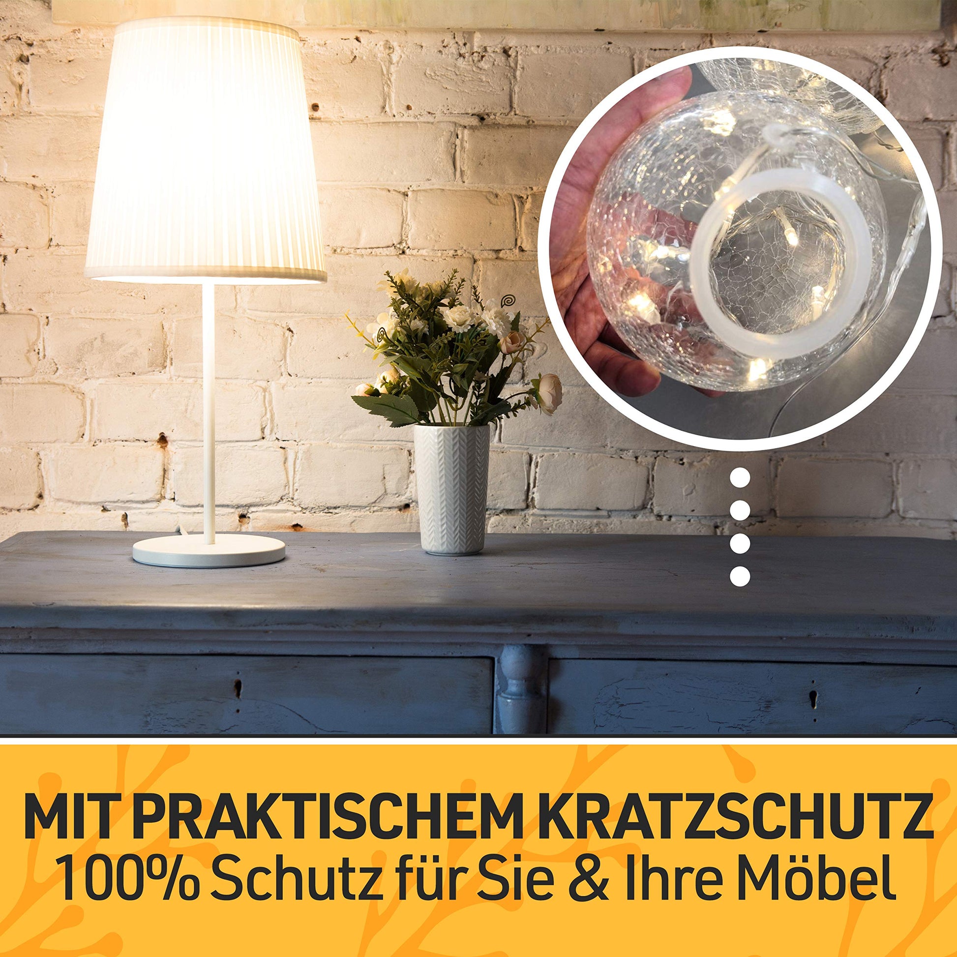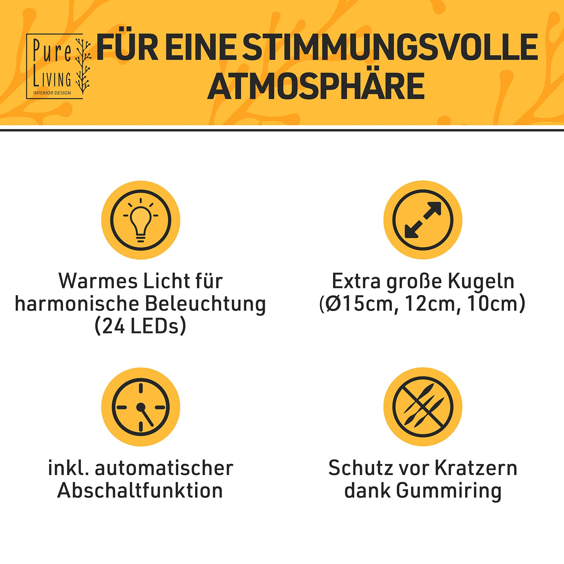 [""]"✅ EXCLUSIVE SIZE - SPECIAL LIGHT ACCENTS: The beautiful 3-piece LED ball set includes extra large light balls of 10, 12 & 15cm, connected by a delicate cable. Delightful as year-round bedroom decor, living room lamp & Co.","✅ LED DECOR MODERN WITH SCRATCH PROTECTION: At the large bottom opening of each LED glass ball is a reliable rubber ring that ensures both your furniture and hands remain free from scratches - 100% protection & premium quality","✅ AUTOMATIC SHUTOFF: LED balls aka table lamp battery operated with timer? Extremely practical, energy-saving & cost-effective! Simply select the sophisticated timer function & each light ball will automatically turn off after 5 hrs","✅ WARM-WHITE LIGHT DREAM: With a total of 24 LEDs, the highlight of your light mood as living room decor, fall decor & Christmas decor indoors AND even without lighting as bathroom decorations, dining table decor, windowsill decor & Co. a top-notch eye-catcher","✅ SUPER FLEXIBLE: In the hallway, as table decoration or rather as window decoration? Create gentle lighting effects with the LED light ball set exactly where you want them - You only need 3x AA batteries (not included)! Your top feel-good atmosphere"