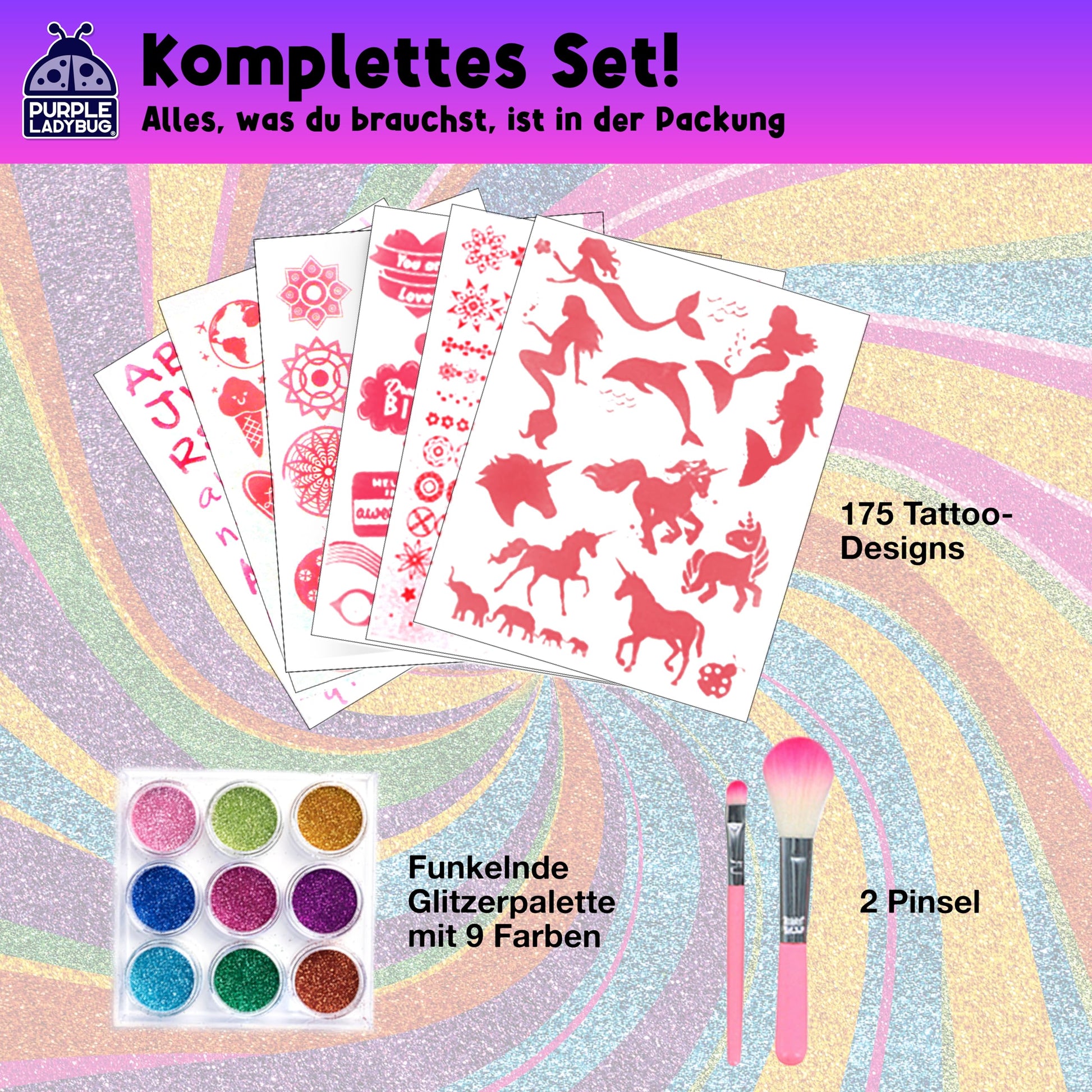 "Biodegradable glitter: Includes 9 high-quality, skin-friendly glitter colors - sustainable, safe for children's skin and perfect for creative tattoos without irritations.",