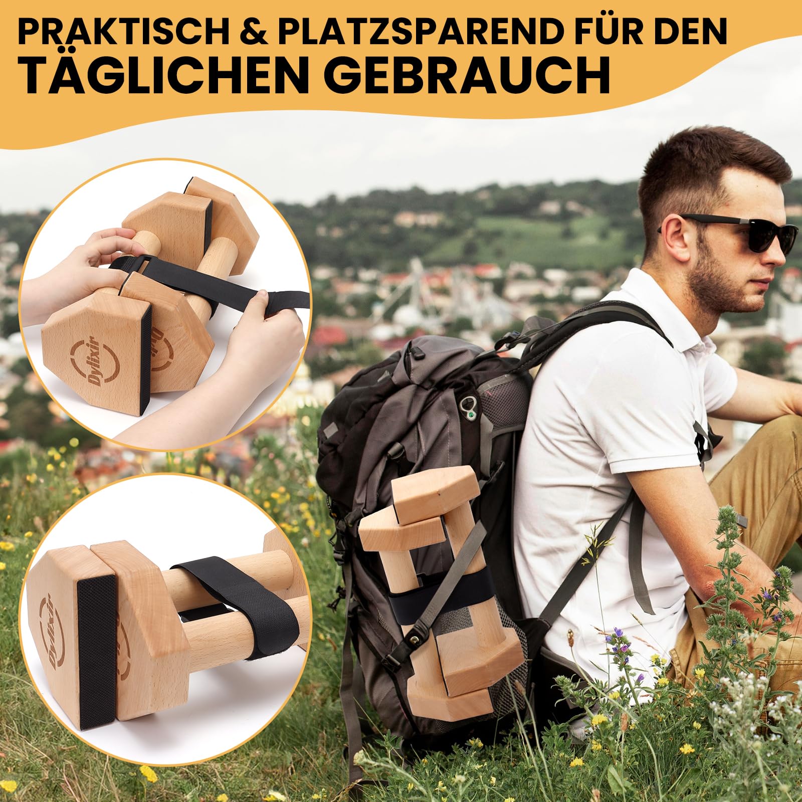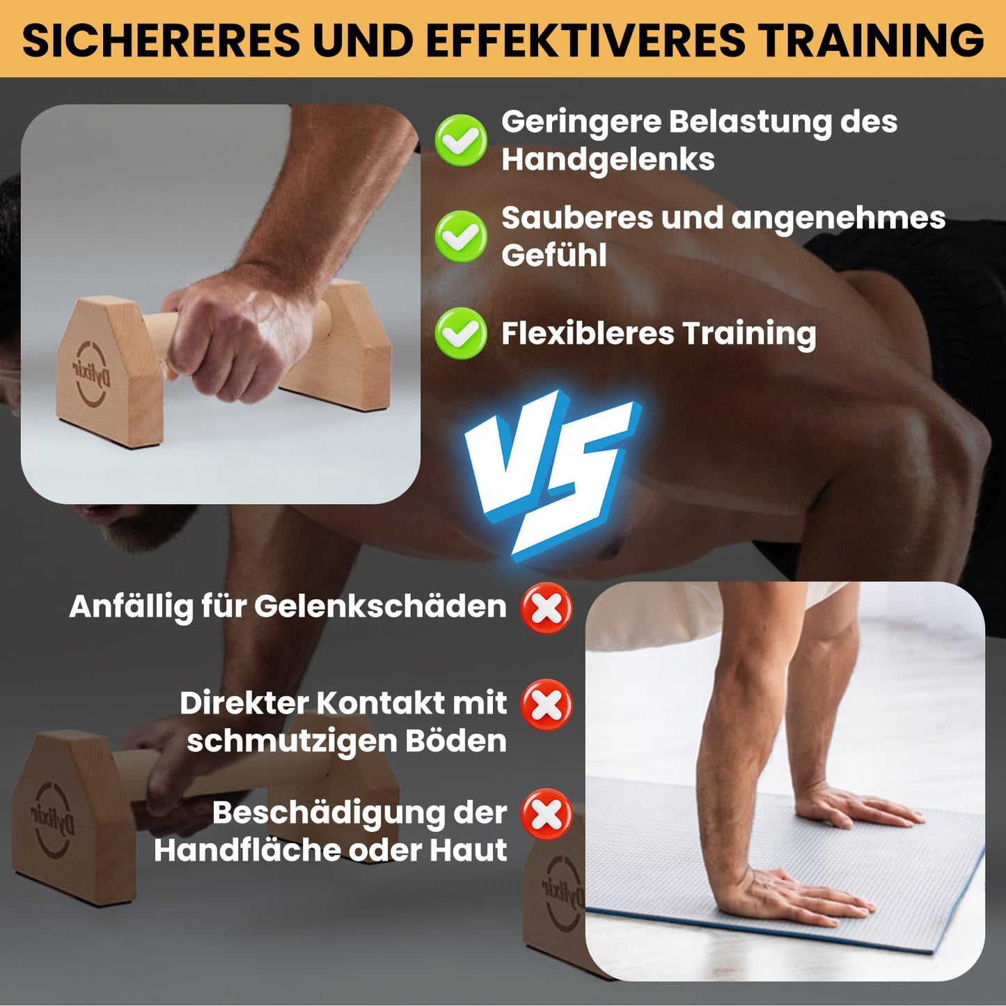 Push Up Bars made of wood for joint-friendly workouts. Perfect for calisthenics and home fitness. Ideal for handstands and push-ups.