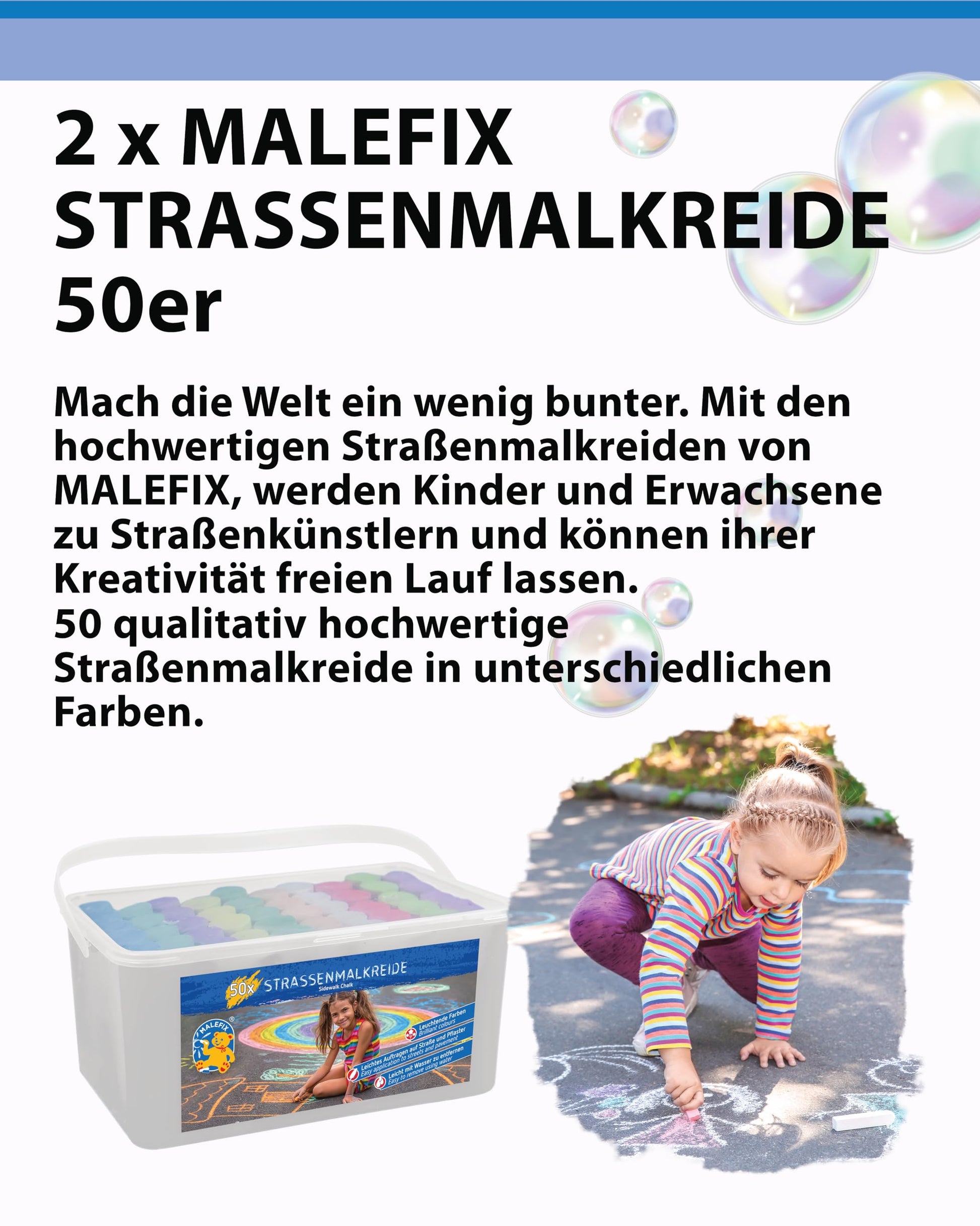 PUSTEFIX MALEFIX Sidewalk Chalk 2 x 50 pieces I Vibrant sidewalk chalk colors, easy to apply I Easily removable with water I For kids & adults