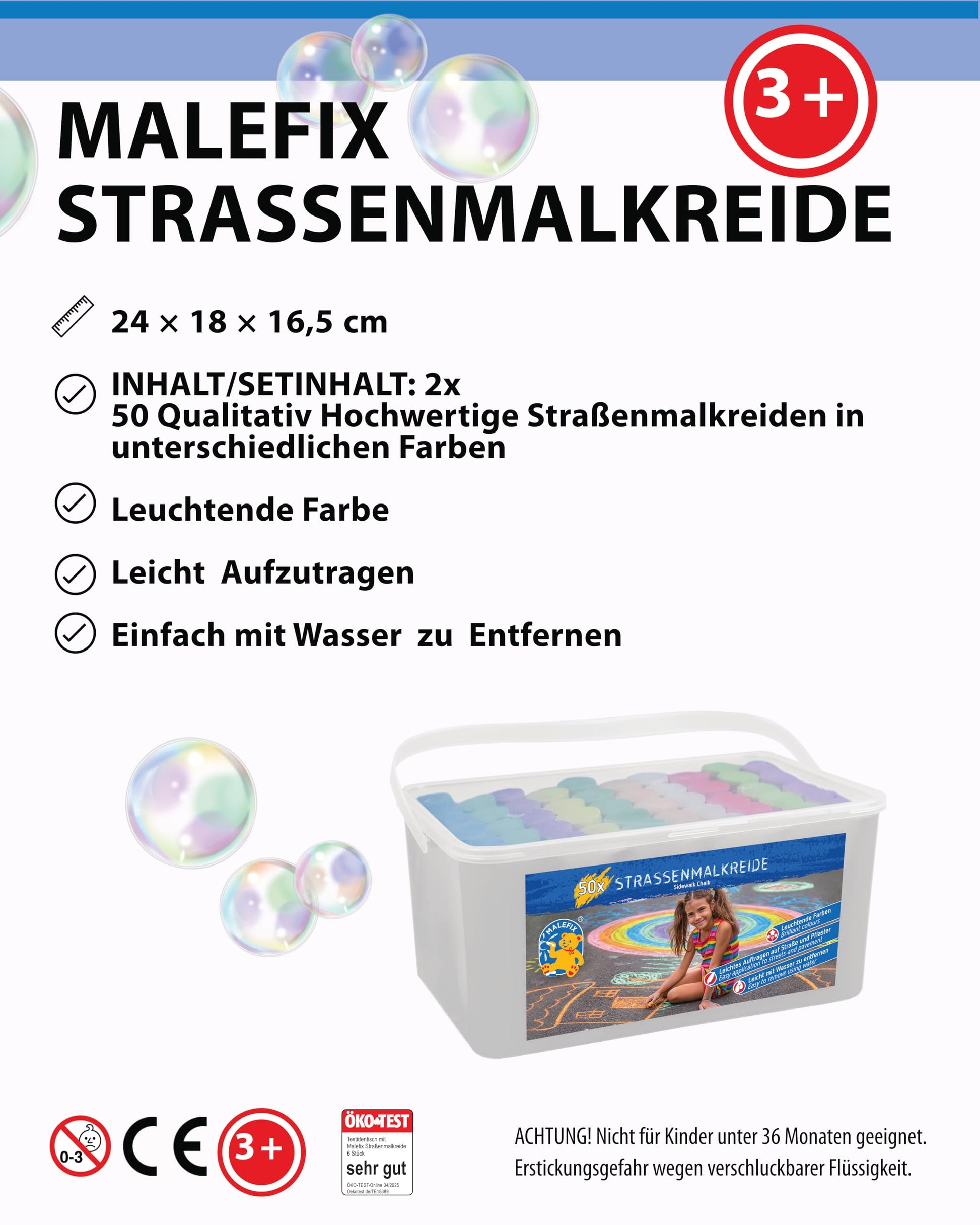 ["VIBRANT COLORS: Our MALEFIX chalk offers a diverse color selection with bright and intense shades that ignite children's creativity","EASY TO REMOVE WITH WATER: The chalk washes off easily with water and leaves no permanent marks on the street. It is environmentally friendly and non-toxic","EASY TO APPLY: The shape and grippy texture of the chalk allow for easy handling and effortless drawing on the ground. This turns children and adults into street artists, allowing their creativity to flow freely","VERSATILE USES: Our sidewalk chalk is not only suitable for drawing on sidewalks, but also for playgrounds, driveways, or yard entrances","CREATIVE OUTDOOR FUN: Our chalk promotes children's imagination and motor skills. They can create street art, hopscotch games, or colorful artworks"]