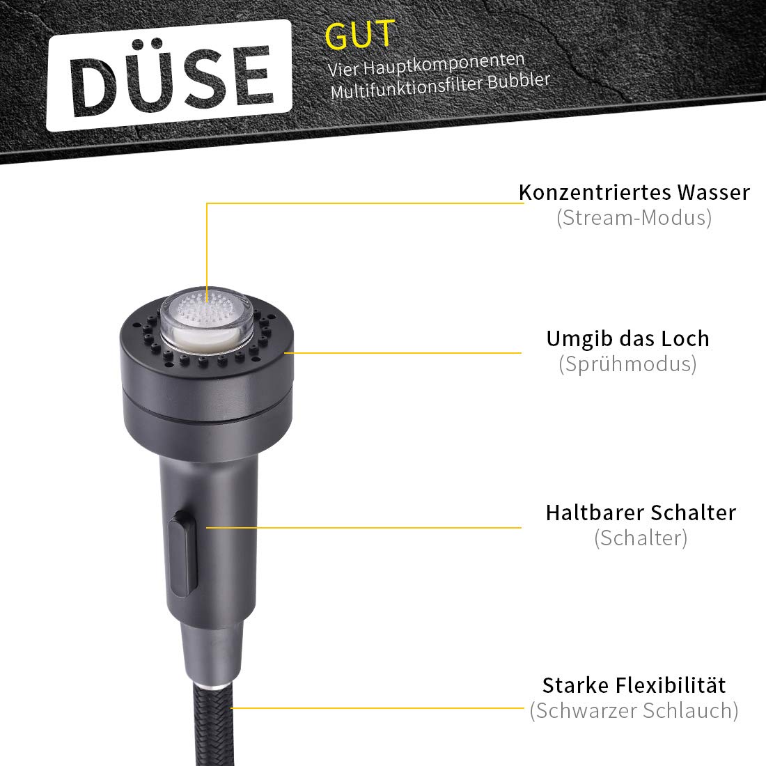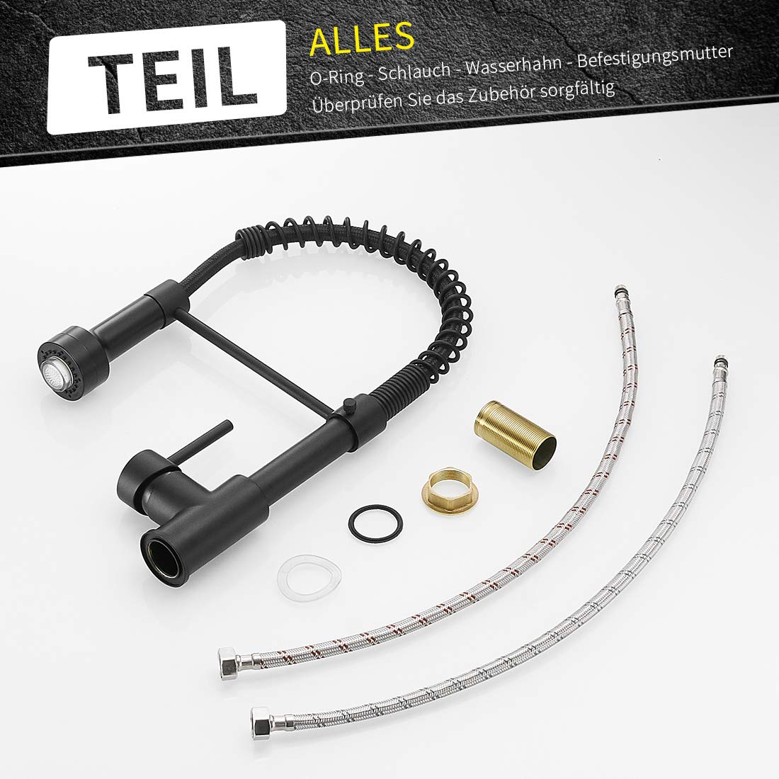 ["Pull-down kitchen faucet with clean lines and slim appearance, making it a timeless and stylish masterpiece for your kitchen.","Two function spray head, very convenient to use, meeting your specific needs. You can choose between spray mode or stream mode. The spray head is detachable for rinsing every part of the dishes and the sink.","High-quality ceramic valve makes this faucet durable and leak-free. Each faucet is tested through hundreds of procedures to ensure no issues arise.","Our kitchen faucets are suitable for most sinks. It can easily be connected to all standard hot and cold water pressure systems with a 3/8" standard connection hose. Easy to assemble, even for beginners.","We promise you a lifetime warranty, providing you with ongoing customer service. Please contact us if you encounter any problems, we will resolve them flawlessly"]