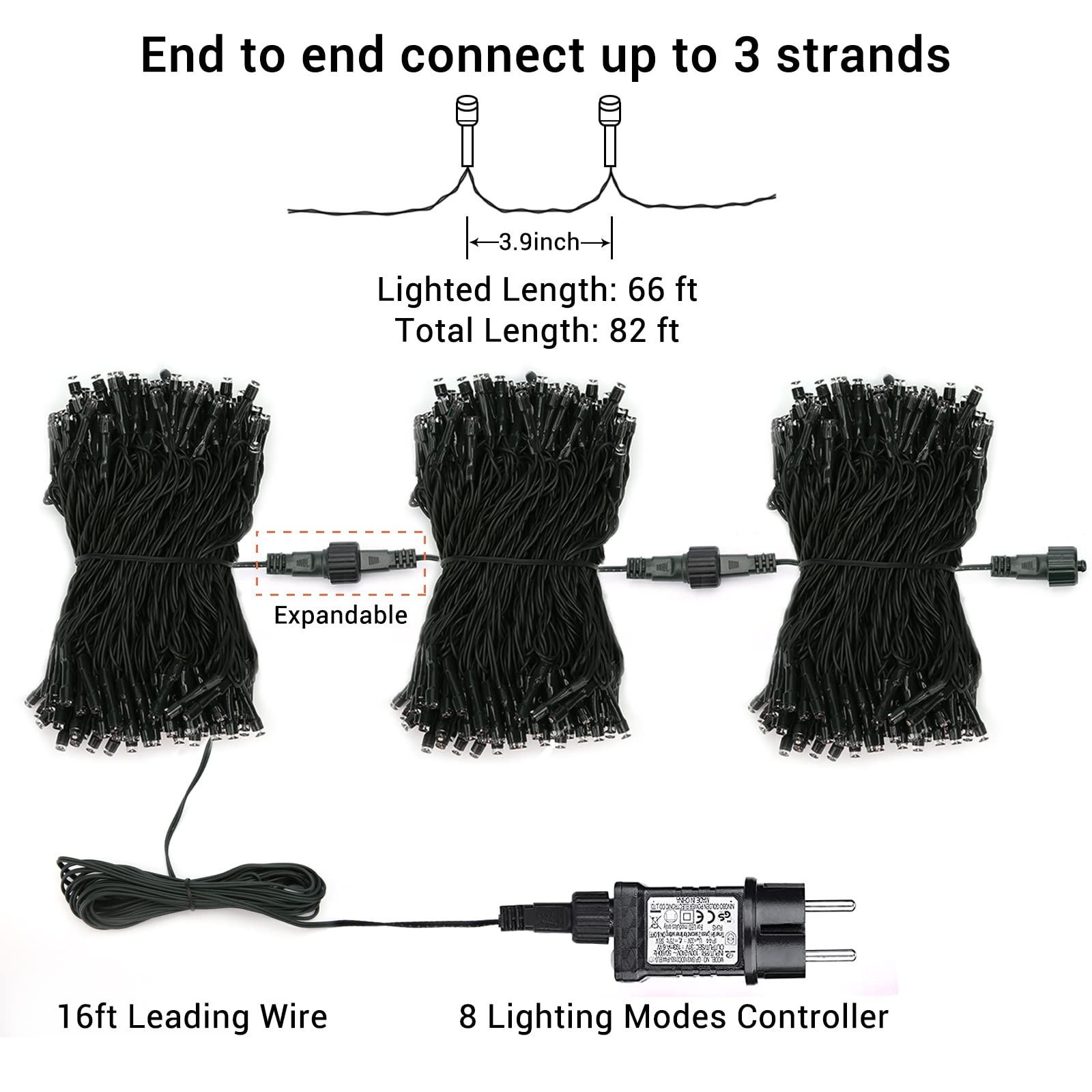 ["π 20M Christmas Tree String Lights: 200 LED outdoor string lights with power, Total length 82ft, the length of the string is 65.6ft, lead wire 16.4ft, Warm White Light. Expandable string lights, max 3 sets, up to 196.8ft 600 LEDs.","π Timer Function: Timer program (6 hours on, 18 hours off) for automatic operation.","π Memory Function: As long as this mode is selected, the light will also shine in the same mode next time, and you don't need to worry about resetting it.","π 8 Lighting Modes: The outdoor Christmas lights with 8 Gorgeous Lighting (Steady on + 7 Flash modes) create different atmospheres for your garden, patio, lawn, porch, yard, etc.","π Customer Service: If you have any questions about the lights, please feel free to contact us. We will provide you with solutions within 24 hours. Your satisfaction is always our goal."]