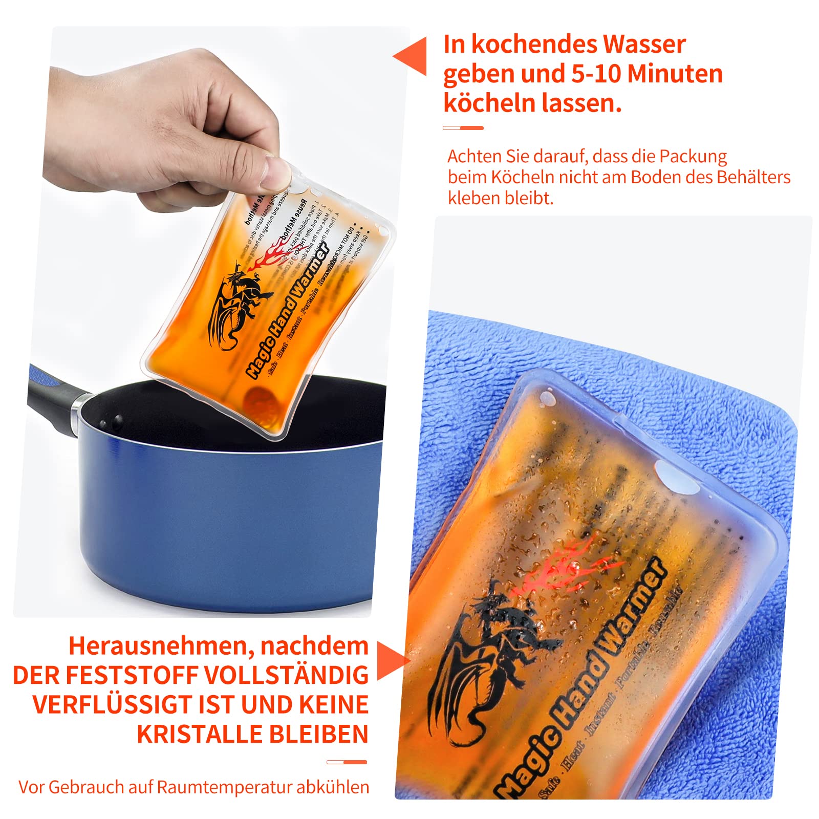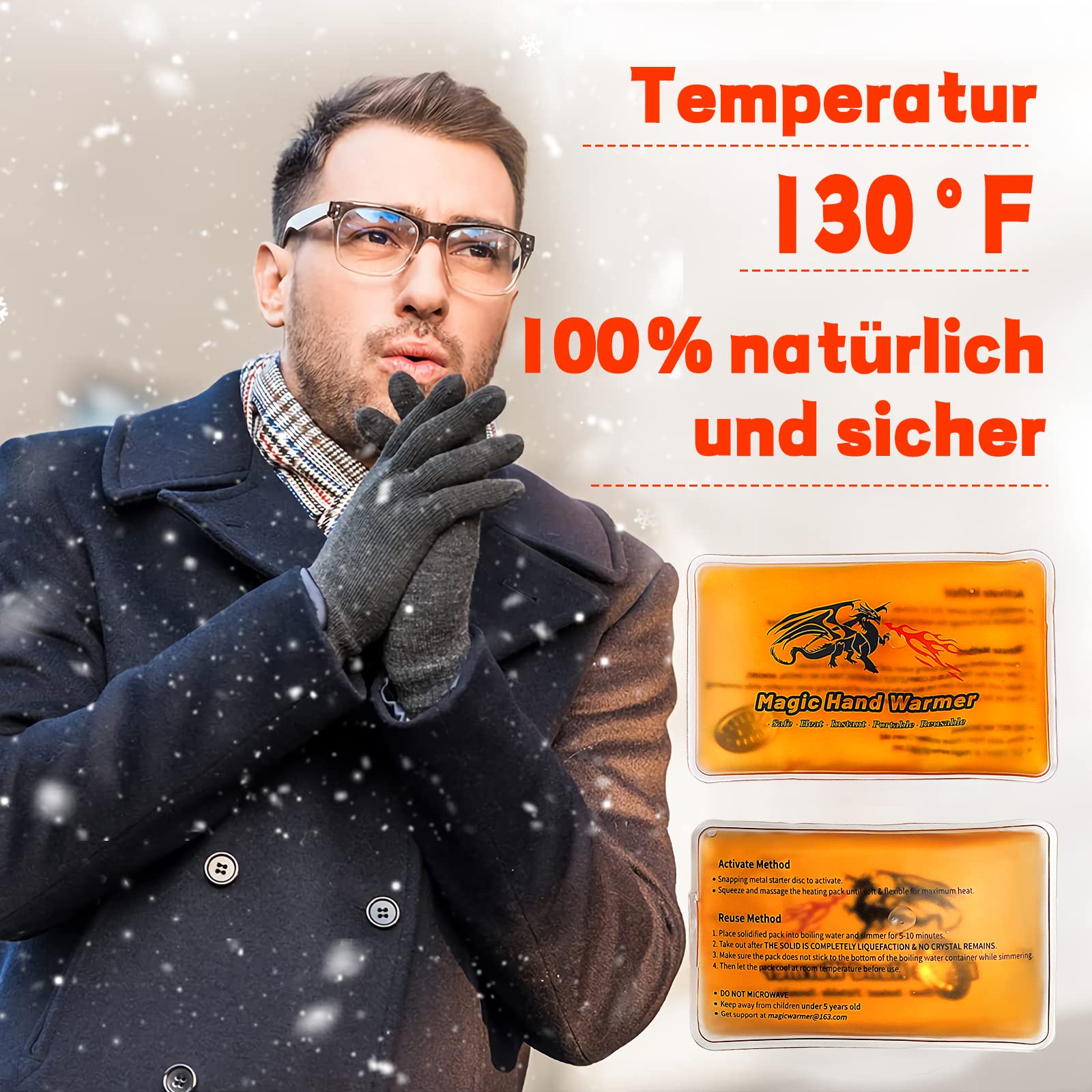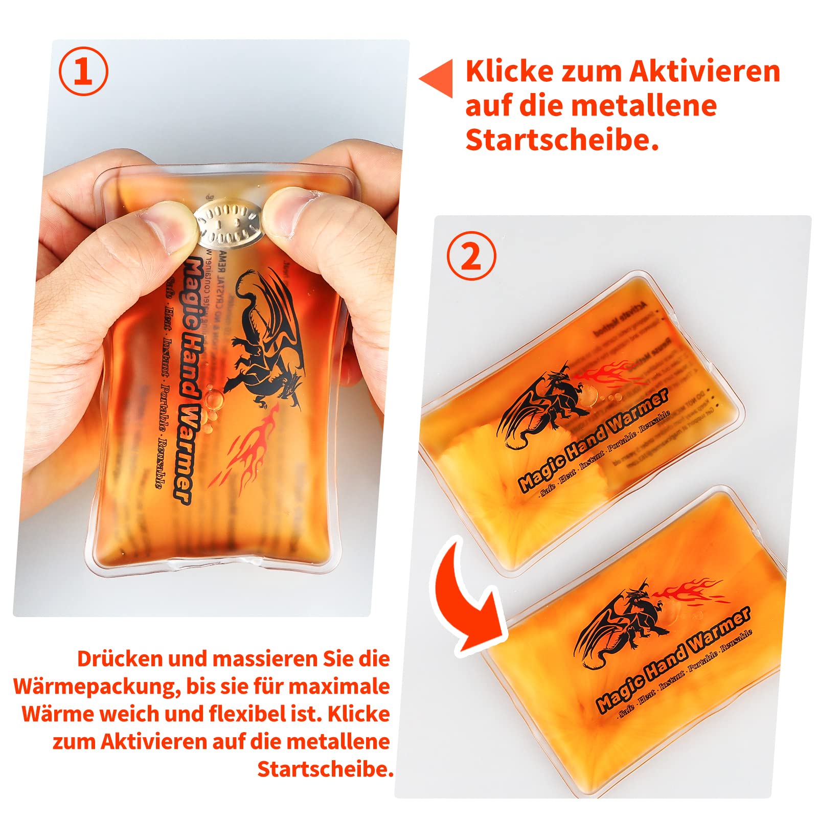 ["Instant warmth without electricity: Click on the metal starter disc to activate it. The internal chemical reaction generates long-lasting heat (129°F).","Reusable magic hand warmers: Charge your magic hand warmers for 10 to 15 minutes in water. Remove and let cool to room temperature. They are then ready for use again.","🔥【Safe, natural warmth】- Ingredients: Durable PVC bags, 12% distilled water, 88% sodium acetate, metal disc - A great, fun way to keep your fingers warm this winter. They work great in pockets, but don't just sit on them. Keep your hands warm during all your outdoor activities when it's cold outside. When cooking, either wrap in a dish towel or stir constantly. Do not let it come into contact with the bottom of the pan as it may damage the product. WARNING! Do not put in the microwave.","Magic hand warmers: The best gift for kids, surprise your friends and family. When you first see or show them to someone, you will know what we mean. They have the "WOW" effect.","Hand warmers Rechargeable hand warmers Heat pack Electric hand warmers Battery-operated heater Football hand warmers Bag Heated gloves Body warmers Football hand warmers Hand warmer heat packs Hand warmer gloves Portable hand warmers Reusable hand warmers Hunting gear Deer hunting accessories Self-defense keychain Reusable heat packs Hand warmer packages"]